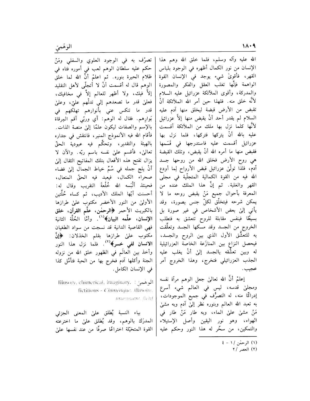 الله عليه وآله وسلم، فلما خلق الله وهم هذا الإنسان من نور الكمال أظهره في الوجود بلباس القهر، فأقوى شيء يوجد في الإنسان القوة الواهمة فإنّها تغلب العقل والفكر والمصورة والمدركة، وأقوى الملائكة عزرائيل عليه السلام لأنّه خلق منه. فلهذا حين أمر الله الملائكة أن تقبض من الأرض قبضة ليخلق منها آدم عليه السلام لم يقدر أحد أن يقبض منها إلّا عزرائيل لأنّها كلما نزل بها ملك من الملائكة أقسمت عليه بالله أن يتركها فتركها، فلما نزل بها عزرائيل أقسمت عليه فاستدرجها في قسمها فقبض منها ما أمره الله أن يقبض، وتلك القبضة هي روح الأرض فخلق الله من روحها جسد آدم، فلذا تولّى عزرائيل قبض الأرواح لما أودع الله فيه من القوة الكمالية المتجلّية في مجلى القهر والغلبة. ثم إنّ هذا الملك عنده من المعرفة بأحوال جميع من يقبض روحه ما لا يمكن شرحه فيتخلّق لكلّ جنس بصورة، وقد يأتي إلى بعض الأشخاص في غير صورة بل بسيطا فينفس مقابلة للروح تتعشق به فتطلب الخروج من الجسد وقد مسكها الجسد وتعلّقت به للتعشّق الأول الذي بين الروح والجسد، فيحصل النزاع بين المنازعة الخاصة العزرائيلية له وبين تعشّقه بالجسد إلى أن يغلب عليه الجذب العزرائيلي فتخرج، وهذا الخروج أمر عجيب.