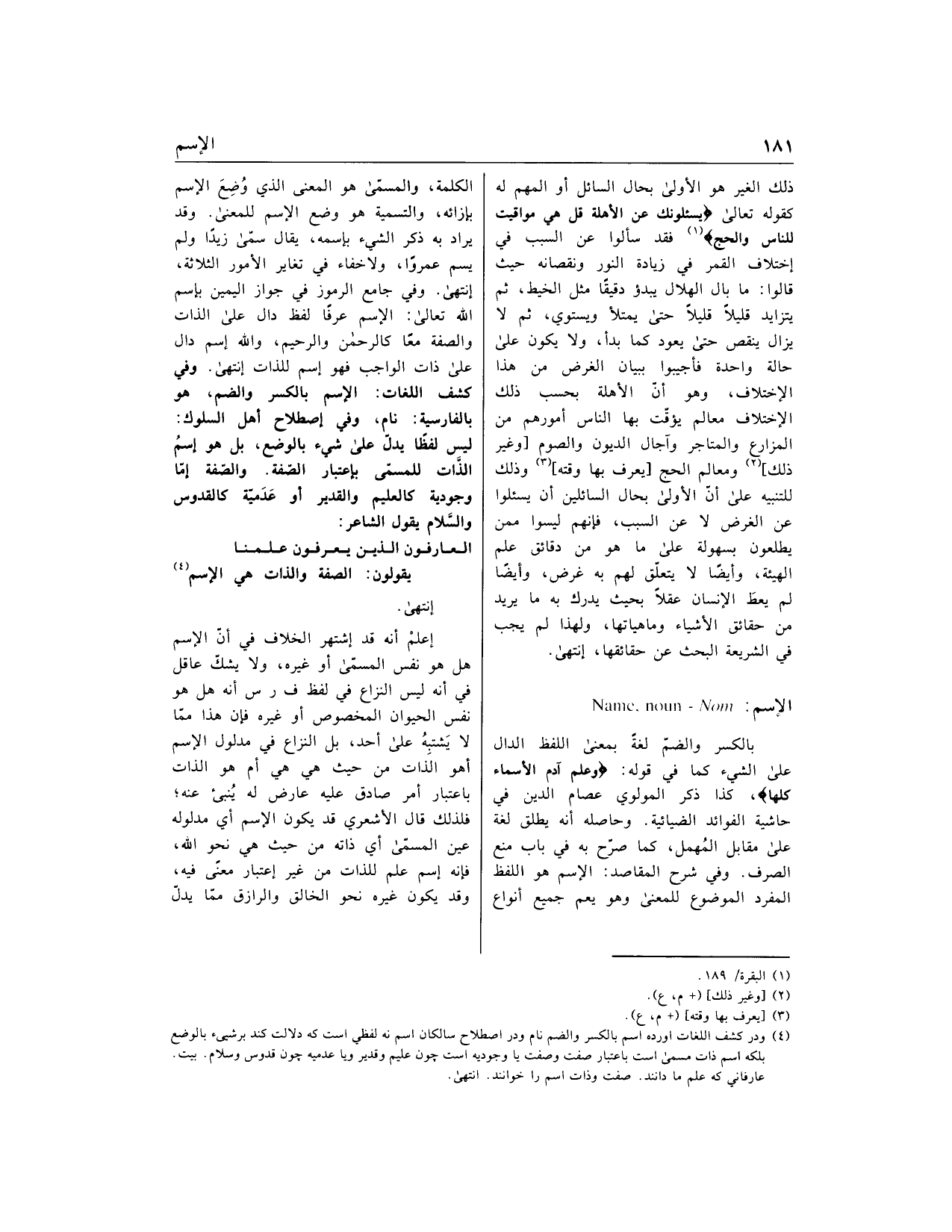 (4) ودر كشف اللغات اورده اسم بالكسر والضم نام ودر اصطلاح سالكان اسم نه لفظي است كه دلالت كند بر شيء بالوضع بلكه اسم ذات مسمى است باعتبار صفت وصفت يا وجوديه است چون عليم وقدير ويا عدميه چون قدوس وسلام. بيت.