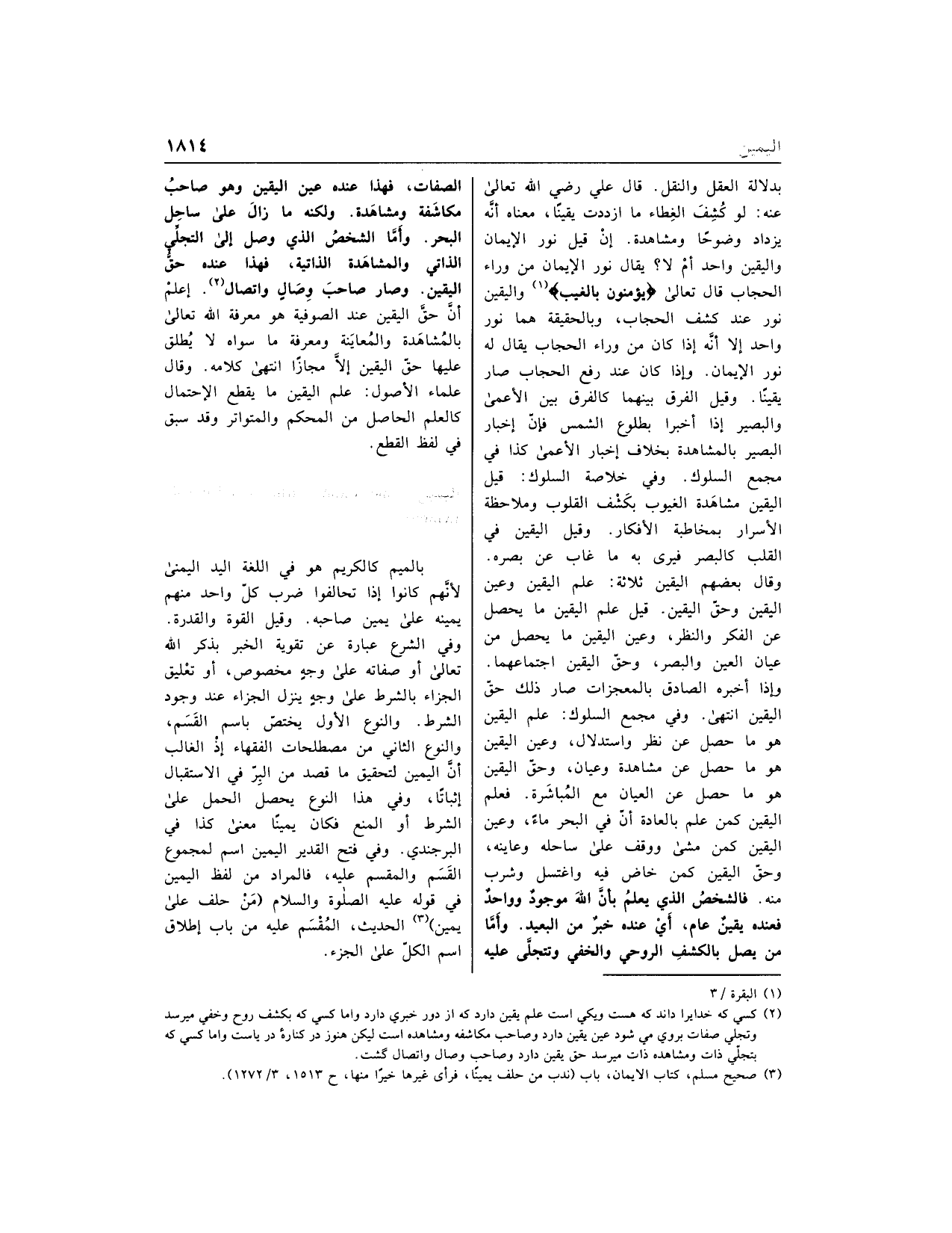 بدلالة العقل والنقل. قال علي رضي الله تعالى عنه: لو كشف الغطاء ما ازددت يقينا، معناه أنّه يزداد وضوحا ومشاهدة. إن قيل نور الإيمان واليقين واحد أم لا؟ يقال نور الإيمان من وراء الحجاب قال تعالى يُؤْمِنُونَ بِالْغَيْبِ «1» واليقين نور عند كشف الحجاب، وبالحقيقة هما نور واحد إلا أنّه إذا كان من وراء الحجاب يقال له نور الإيمان. وإذا كان عند رفع الحجاب صار يقينا. وقيل الفرق بينهما كالفرق بين الأعمى والبصير إذا أخبرا بطلوع الشمس فإنّ إخبار البصير بالمشاهدة بخلاف إخبار الأعمى كذا في مجمع السلوك. وفي خلاصة السلوك: قيل اليقين مشاهدة الغيوب بكشف القلوب وملاحظة الأسرار بمخاطبة الأفكار. وقيل اليقين في القلب كالبصر فيرى به ما غاب عن بصره.