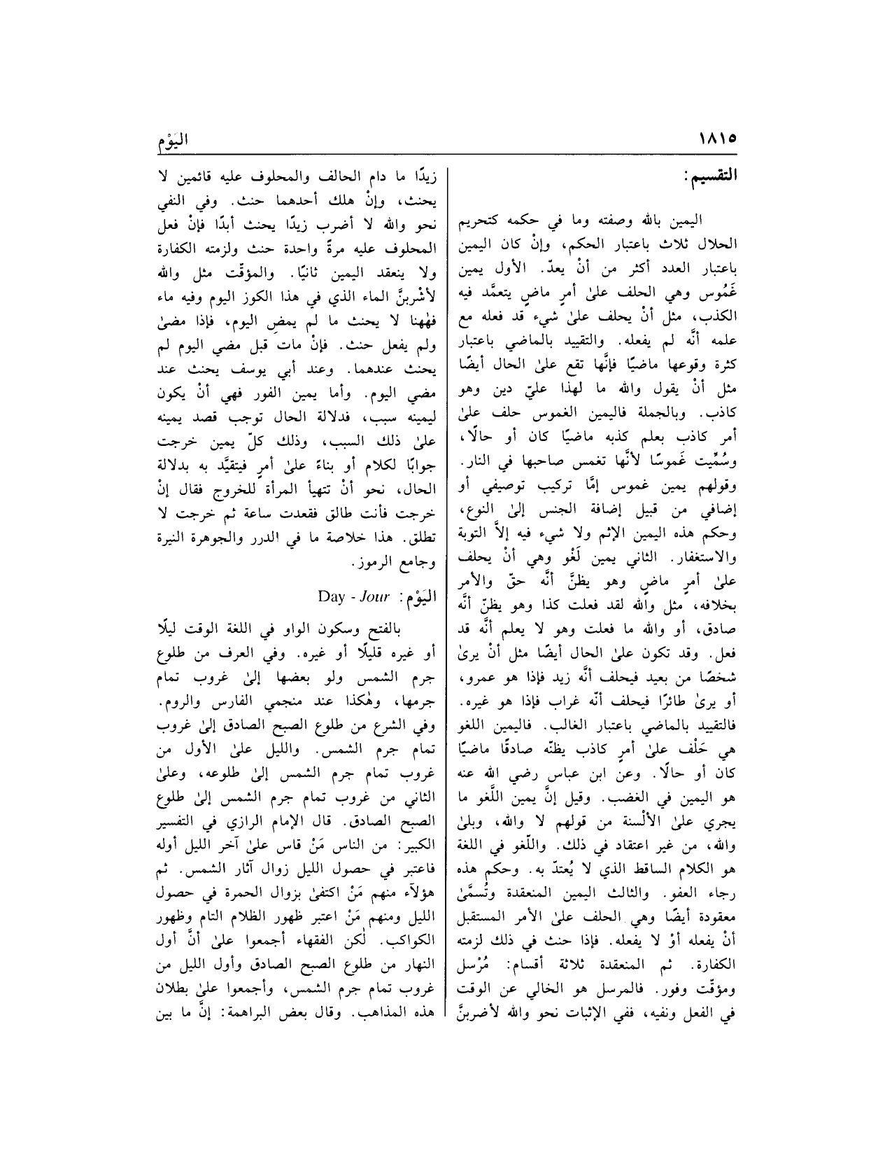وفي الشرع من طلوع الصبح الصادق إلى غروب تمام جرم الشمس. والليل على الأول من غروب تمام جرم الشمس إلى طلوعه، وعلى الثاني من غروب تمام جرم الشمس إلى طلوع الصبح الصادق. قال الإمام الرازي في التفسير الكبير: من الناس من قاس على آخر الليل أوله فاعتبر في حصول الليل زوال آثار الشمس. ثم هؤلاء منهم من اكتفى بزوال الحمرة في حصول الليل ومنهم من اعتبر ظهور الظلام التام وظهور الكواكب. لكن الفقهاء أجمعوا على أنّ أول النهار من طلوع الصبح الصادق وأول الليل من غروب تمام جرم الشمس، وأجمعوا على بطلان هذه المذاهب. وقال بعض البراهمة: إنّ ما بين