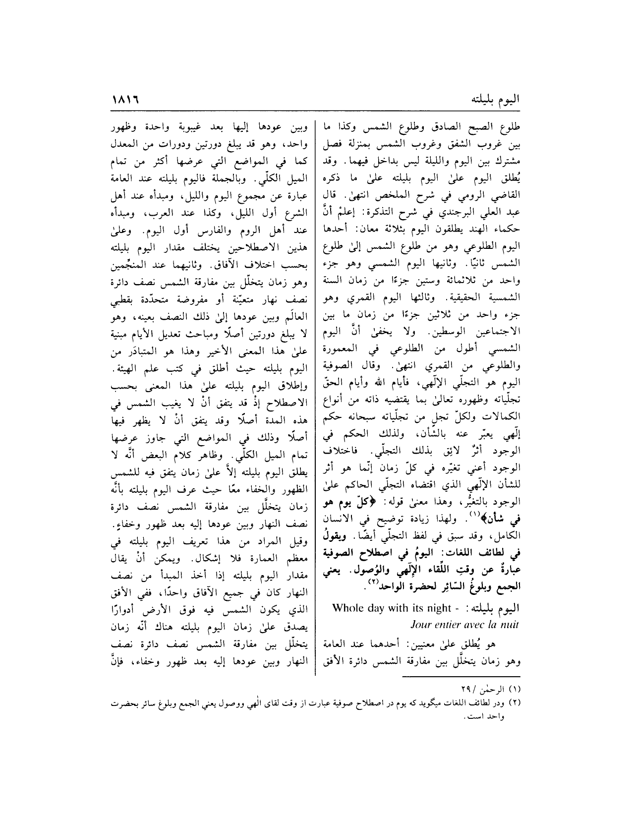 طلوع الصبح الصادق وطلوع الشمس وكذا ما بين غروب الشفق وغروب الشمس بمنزلة فصل مشترك بين اليوم والليلة ليس بداخل فيهما. وقد يطلق اليوم على اليوم بليلته على ما ذكره القاضي الرومي في شرح الملخص انتهى. قال عبد العلي البرجندي في شرح التذكرة: اعلم أنّ حكماء الهند يطلقون اليوم بثلاثة معان: أحدها اليوم الطلوعي وهو من طلوع الشمس إلى طلوع الشمس ثانيا. وثانيها اليوم الشمسي وهو جزء واحد من ثلاثمائة وستين جزءا من زمان السنة الشمسية الحقيقية. وثالثها اليوم القمري وهو جزء واحد من ثلاثين جزءا من زمان ما بين الاجتماعين الوسطين. ولا يخفى أنّ اليوم الشمسي أطول من الطلوعي في المعمورة والطلوعي من القمري انتهى. وقال الصوفية اليوم هو التجلّي الإلهي، فأيام الله وأيام الحقّ تجلّياته وظهوره تعالى بما يقتضيه ذاته من أنواع الكمالات ولكلّ تجل من تجلّياته سبحانه حكم إلهي يعبّر عنه بالشأن، ولذلك الحكم في الوجود أثر لائق بذلك التجلّي. فاختلاف الوجود أعني تغيّره في كلّ زمان إنّما هو أثر للشأن الإلهي الذي اقتضاه التجلّي الحاكم على الوجود بالتغيّر، وهذا معنى قوله: كُلَّ يَوْمٍ هُوَ فِي شَأْنٍ «1» ولهذا زيادة توضيح في الإنسان الكامل، وقد سبق في لفظ التجلّي أيضا. ويقول في لطائف اللغات: اليوم في اصطلاح الصوفية عبارة عن وقت اللّقاء الإلهي والوصول. يعني الجمع وبلوغ السّائر لحضرة الواحد «2».