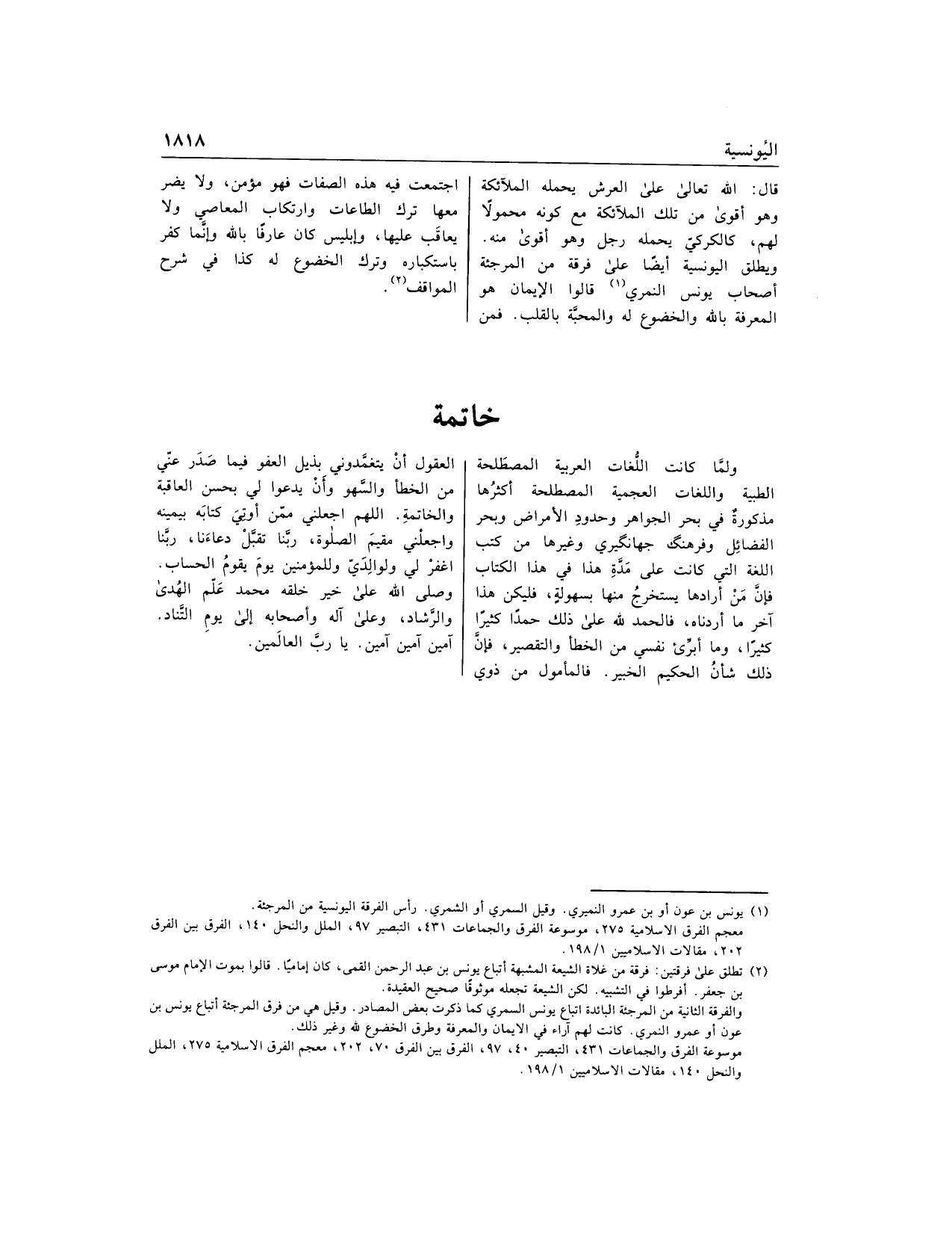 ويطلق اليونسية أيضا على فرقة من المرجئة أصحاب يونس النمري «1» قالوا الإيمان هو المعرفة بالله والخضوع له والمحبّة بالقلب. فمن اجتمعت فيه هذه الصفات فهو مؤمن، ولا يضر معها ترك الطاعات وارتكاب المعاصي ولا يعاقب عليها، وإبليس كان عارفا بالله وإنّما كفر باستكباره وترك الخضوع له كذا في شرح المواقف «2».