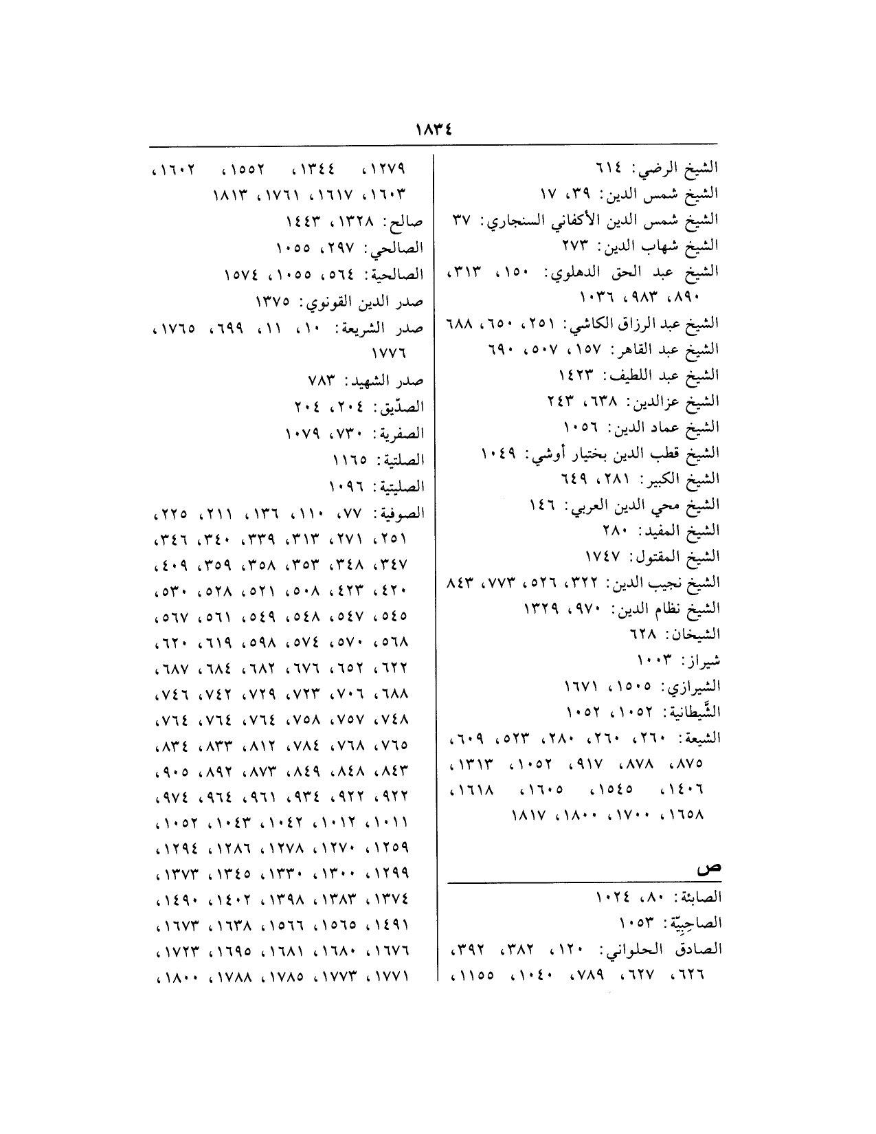 الصوفية: 77، 110، 136، 211، 225، 251، 271، 313، 339، 340، 346، 347، 348، 353، 358، 359، 409، 420، 423، 508، 521، 528، 530، 545، 547، 548، 549، 561، 567، 568، 570، 574، 598، 619، 620، 622، 652، 676، 682، 684، 687، 688، 706، 723، 729، 742، 746، 748، 757، 758، 764، 764، 764، 765، 768، 784، 812، 833، 834، 843، 848، 849، 873، 892، 905، 922، 922، 934، 961، 964، 974، 1011، 1012، 1042، 1043، 1052، 1259، 1270، 1278، 1286، 1294، 1299، 1300، 1330، 1345، 1373، 1374، 1383، 1398، 1402، 1490، 1491، 1565، 1566، 1638، 1673، 1676، 1680، 1681، 1695، 1723، 1771، 1773، 1785، 1788، 1800،