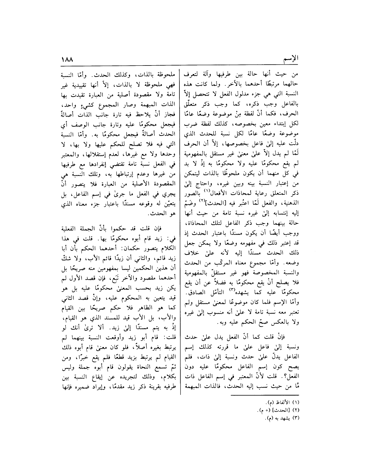 فإن قلت كما أنّ الفعل يدل على حدث ونسبة إلى فاعل على ما قررته كذلك اسم الفاعل يدلّ على حدث ونسبة إلى ذات، فلم يصح كون اسم الفاعل محكوما عليه دون الفعل؟. قلت لأنّ المعتبر في اسم الفاعل ذات ما من حيث نسب إليه الحدث، فالذات المبهمة ملحوظة بالذات، وكذلك الحدث. وأمّا النسبة فهي ملحوظة لا بالذات، إلّا أنها تقييدية غير تامة ولا مقصودة أصلية من العبارة تقيدت بها الذات المبهمة وصار المجموع كشيء واحد، فجاز أن يلاحظ فيه تارة جانب الذات أصالة فيجعل محكوما عليه وتارة جانب الوصف أي الحدث أصالة فيجعل محكوما به. وأمّا النسبة التي فيه فلا تصلح للحكم عليها ولا بها، لا وحدها ولا مع غيرها، لعدم استقلالها، والمعتبر في الفعل نسبة تامة تقتضي انفرادها مع طرفيها من غيرها وعدم ارتباطها به، وتلك النسبة هي المقصودة الأصلية من العبارة فلا يتصور أن يجري في الفعل ما جرى في اسم الفاعل، بل يتعيّن له وقوعه مسندا باعتبار جزء معناه الذي هو الحدث.
