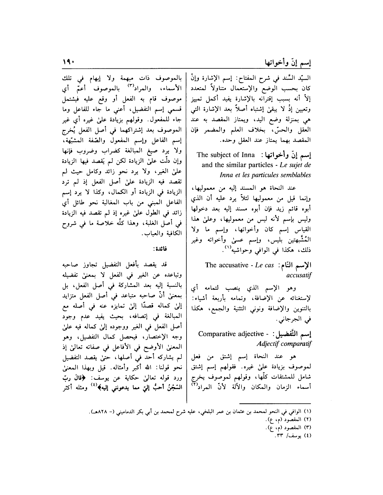 قد يقصد بأفعل التفضيل تجاوز صاحبه وتباعده عن الغير في الفعل لا بمعنى تفضيله بالنسبة إليه بعد المشاركة في أصل الفعل، بل بمعنى أنّ صاحبه متباعد في أصل الفعل متزايد إلى كماله قصدا إلى تمايزه عنه في أصله مع المبالغة في اتصافه، بحيث يفيد عدم وجود أصل الفعل في الغير ووجوده إلى كماله فيه على وجه الاختصار، فيحصل كمال التفضيل، وهو المعنى الأوضح في الأفاعل في صفاته تعالى إذ لم يشاركه أحد في أصلها، حتى يقصد التفضيل نحو قولنا: الله أكبر وأمثاله. قيل وبهذا المعنى ورد قوله تعالى حكاية عن يوسف: قالَ رَبِّ السِّجْنُ أَحَبُّ إِلَيَّ مِمَّا يَدْعُونَنِي إِلَيْهِ «4» ومثله أكثر