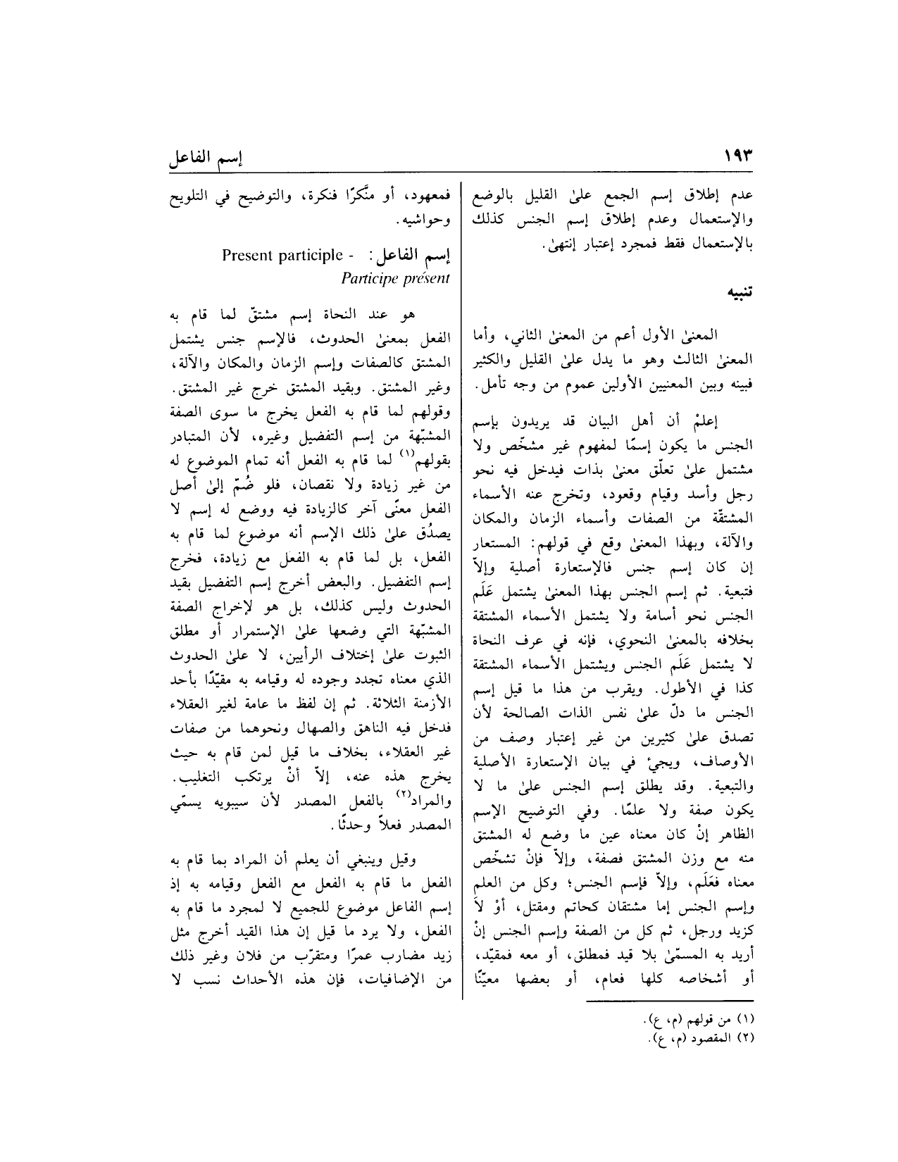 وقولهم لما قام به الفعل يخرج ما سوى الصفة المشبّهة من اسم التفضيل وغيره، لأن المتبادر بقولهم «1» لما قام به الفعل أنه تمام الموضوع له من غير زيادة ولا نقصان، فلو ضمّ إلى أصل الفعل معنى آخر كالزيادة فيه ووضع له اسم لا يصدق على ذلك الاسم أنه موضوع لما قام به الفعل، بل لما قام به الفعل مع زيادة، فخرج اسم التفضيل. والبعض أخرج اسم التفضيل بقيد الحدوث وليس كذلك، بل هو لإخراج الصفة المشبّهة التي وضعها على الاستمرار أو مطلق الثبوت على إختلاف الرأيين، لا على الحدوث الذي معناه تجدد وجوده له وقيامه به مقيّدا بأحد الأزمنة الثلاثة. ثم إن لفظ ما عامة لغير العقلاء فدخل فيه الناهق والصهال ونحوهما من صفات غير العقلاء، بخلاف ما قيل لمن قام به حيث يخرج هذه عنه، إلّا أن يرتكب التغليب.