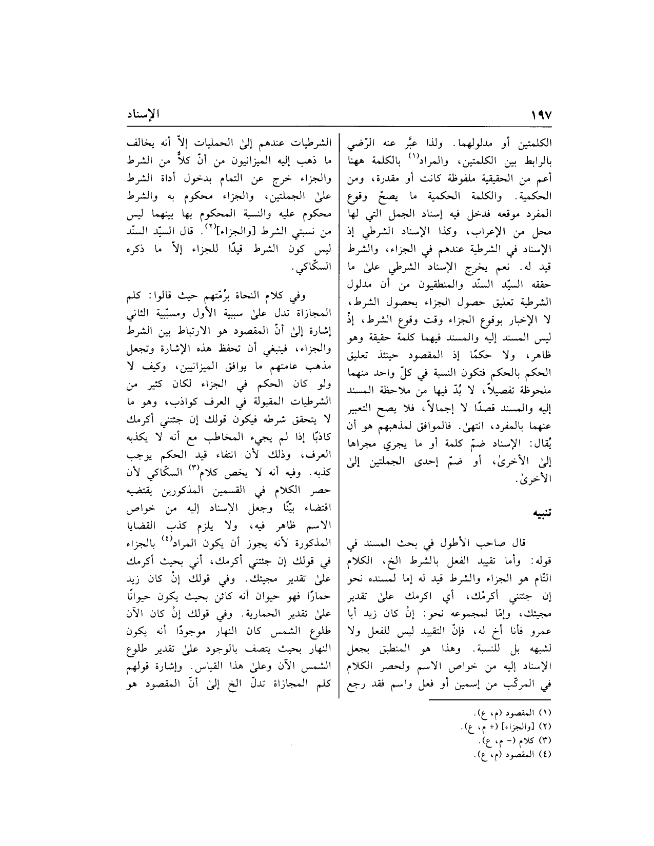 وفي كلام النحاة برمّتهم حيث قالوا: كلم المجازاة تدل على سببية الأول ومسبّبية الثاني إشارة إلى أنّ المقصود هو الارتباط بين الشرط والجزاء، فينبغي أن تحفظ هذه الإشارة وتجعل مذهب عامتهم ما يوافق الميزانيين، وكيف لا ولو كان الحكم في الجزاء لكان كثير من الشرطيات المقبولة في العرف كواذب، وهو ما لا يتحقق شرطه فيكون قولك إن جئتني أكرمك كاذبا إذا لم يجيء المخاطب مع أنه لا يكذبه العرف، وذلك لأن انتفاء قيد الحكم يوجب كذبه. وفيه أنه لا يخص كلام «3» السكّاكي لأن حصر الكلام في القسمين المذكورين يقتضيه اقتضاء بيّنا وجعل الإسناد إليه من خواص الاسم ظاهر فيه، ولا يلزم كذب القضايا المذكورة لأنه يجوز أن يكون المراد «4» بالجزاء في قولك إن جئتني أكرمك، أني بحيث أكرمك على تقدير مجيئك. وفي قولك إن كان زيد حمارا فهو حيوان أنه كائن بحيث يكون حيوانا على تقدير الحمارية. وفي قولك إن كان الآن طلوع الشمس كان النهار موجودا أنه يكون النهار بحيث يتصف بالوجود على تقدير طلوع الشمس الآن وعلى هذا القياس. وإشارة قولهم كلم المجازاة تدلّ الخ إلى أنّ المقصود هو