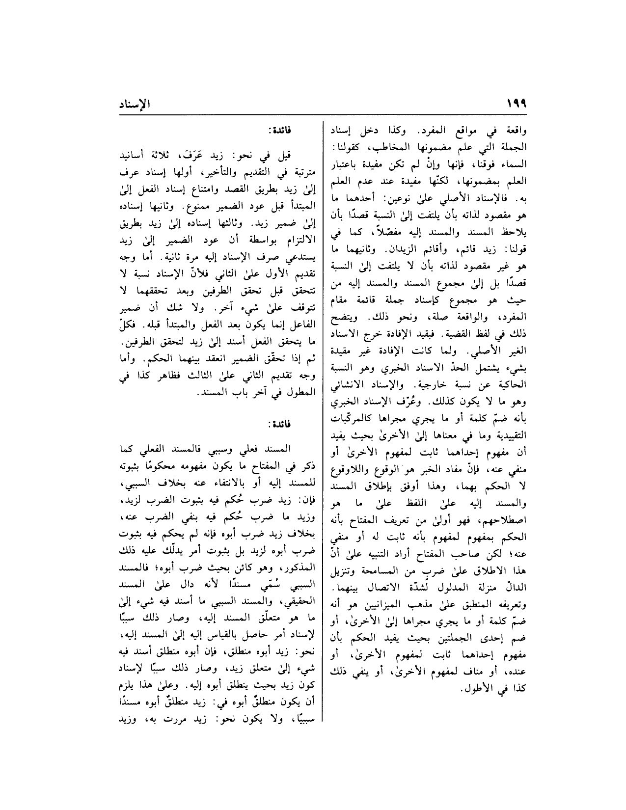 قيل في نحو: زيد عرف، ثلاثة أسانيد مترتبة في التقديم والتأخير، أولها إسناد عرف إلى زيد بطريق القصد وامتناع إسناد الفعل إلى المبتدأ قبل عود الضمير ممنوع. وثانيها إسناده إلى ضمير زيد. وثالثها إسناده إلى زيد بطريق الالتزام بواسطة أن عود الضمير إلى زيد يستدعي صرف الإسناد إليه مرة ثانية. أما وجه تقديم الأول على الثاني فلأنّ الإسناد نسبة لا تتحقق قبل تحقق الطرفين وبعد تحققهما لا تتوقف على شيء آخر. ولا شك أن ضمير الفاعل إنما يكون بعد الفعل والمبتدأ قبله. فكلّ ما يتحقق الفعل أسند إلى زيد لتحقق الطرفين.