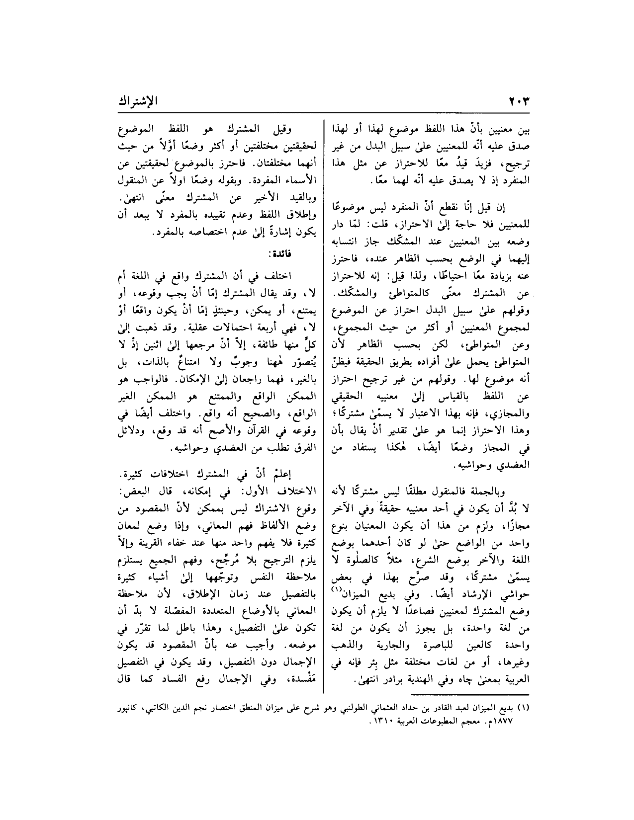 وبالجملة فالمنقول مطلقا ليس مشتركا لأنه لا بدّ أن يكون في أحد معنييه حقيقة وفي الآخر مجازا، ولزم من هذا أن يكون المعنيان بنوع واحد من الواضع حتى لو كان أحدهما بوضع اللغة والآخر بوضع الشرع، مثلا كالصلاة لا يسمّى مشتركا، وقد صرّح بهذا في بعض حواشي الإرشاد أيضا. وفي بديع الميزان «1» وضع المشترك لمعنيين فصاعدا لا يلزم أن يكون من لغة واحدة، بل يجوز أن يكون من لغة واحدة كالعين للباصرة والجارية والذهب وغيرها، أو من لغات مختلفة مثل بئر فإنه في العربية بمعنى چاه وفي الهندية برادر انتهى.