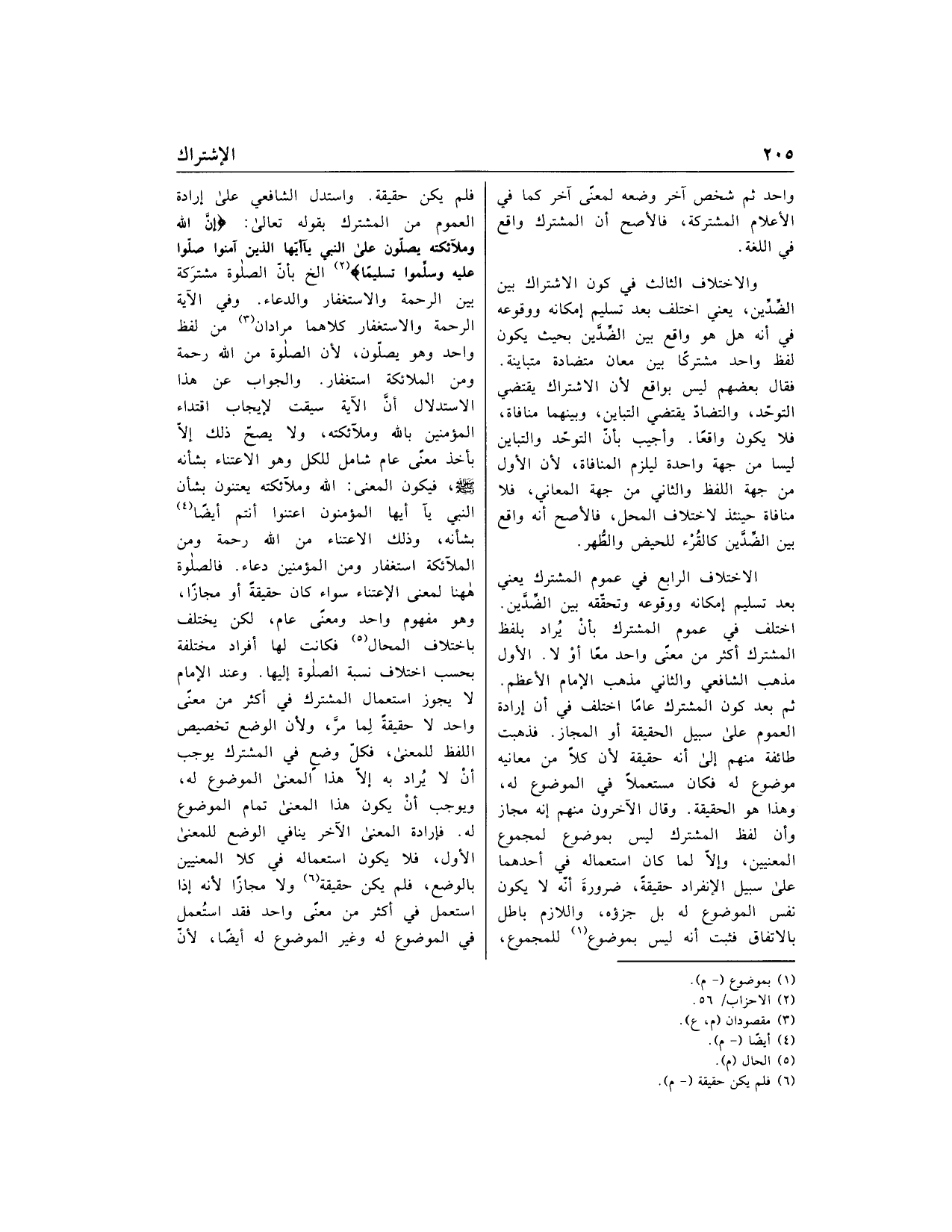 ثم بعد كون المشترك عاما اختلف في أن إرادة العموم على سبيل الحقيقة أو المجاز. فذهبت طائفة منهم إلى أنه حقيقة لأن كلا من معانيه موضوع له فكان مستعملا في الموضوع له، وهذا هو الحقيقة. وقال الآخرون منهم إنه مجاز وأن لفظ المشترك ليس بموضوع لمجموع المعنيين، وإلّا لما كان استعماله في أحدهما على سبيل الانفراد حقيقة، ضرورة أنّه لا يكون نفس الموضوع له بل جزؤه، واللازم باطل بالاتفاق فثبت أنه ليس بموضوع «1» للمجموع، فلم يكن حقيقة. واستدل الشافعي على إرادة العموم من المشترك بقوله تعالى: إِنَّ اللَّهَ وَمَلائِكَتَهُ يُصَلُّونَ عَلَى النَّبِيِّ يا أَيُّهَا الَّذِينَ آمَنُوا صَلُّوا عَلَيْهِ وَسَلِّمُوا تَسْلِيماً «2» الخ بأنّ الصلاة مشتركة بين الرحمة والاستغفار والدعاء. وفي الآية الرحمة والاستغفار كلاهما مرادان «3» من لفظ واحد وهو يصلّون، لأن الصلاة من الله رحمة ومن الملائكة استغفار. والجواب عن هذا الاستدلال أنّ الآية سيقت لإيجاب اقتداء المؤمنين بالله وملائكته، ولا يصحّ ذلك إلّا بأخذ معنى عام شامل للكل وهو الاعتناء بشأنه صلى الله عليه وسلم، فيكون المعنى: الله وملائكته يعتنون بشأن النبي يا أيها المؤمنون اعتنوا أنتم أيضا «4» بشأنه، وذلك الاعتناء من الله رحمة ومن الملائكة استغفار ومن المؤمنين دعاء. فالصلاة هاهنا لمعنى الاعتناء سواء كان حقيقة أو مجازا، وهو مفهوم واحد ومعنى عام، لكن يختلف باختلاف المحال «5» فكانت لها أفراد مختلفة بحسب اختلاف نسبة الصلاة إليها. وعند الإمام لا يجوز استعمال المشترك في أكثر من معنى واحد لا حقيقة لما مرّ، ولأن الوضع تخصيص اللفظ للمعنى، فكلّ وضع في المشترك يوجب أن لا يراد به إلّا هذا المعنى الموضوع له، ويوجب أن يكون هذا المعنى تمام الموضوع له. فإرادة المعنى الآخر ينافي الوضع للمعنى الأول، فلا يكون استعماله في كلا المعنيين بالوضع، فلم يكن حقيقة «6» ولا مجازا لأنه إذا استعمل في أكثر من معنى واحد فقد استعمل في الموضوع له وغير الموضوع له أيضا، لأنّ