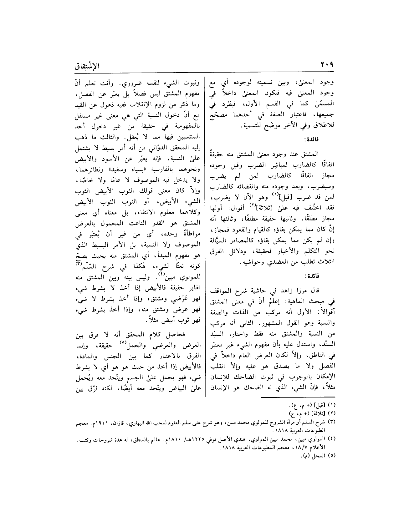 قال مرزا زاهد في حاشية شرح المواقف في مبحث الماهية: اعلم أنّ في معنى المشتق أقوالا: الأول أنه مركب من الذات والصفة والنسبة وهو القول المشهور. الثاني أنه مركب من النسبة والمشتق منه فقط واختاره السيّد السّند، واستدل عليه بأن مفهوم الشيء غير معتبر في الناطق، وإلّا لكان العرض العام داخلا في الفصل ولا ما يصدق هو عليه وإلّا انقلب الإمكان بالوجوب في ثبوت الضاحك للإنسان مثلا، فإنّ الشيء الذي له الضحك هو الإنسان وثبوت الشيء لنفسه ضروري. وأنت تعلم أنّ مفهوم المشتق ليس فصلا بل يعبّر عن الفصل، وما ذكر من لزوم الانقلاب ففيه ذهول عن القيد مع أنّ دخول النسبة التي هي معنى غير مستقل بالمفهومية في حقيقة من غير دخول أحد المنتسبين فيها مما لا يعقل. والثالث ما ذهب إليه المحقق الدّواني من أنه أمر بسيط لا يشتمل على النسبة، فإنه يعبّر عن الأسود والأبيض ونحوهما بالفارسية «بسياه وسفيد» ونظائرهما، ولا يدخل فيه الموصوف لا عاما ولا خاصا، وإلّا كان معنى قولك الثوب الأبيض الثوب الشيء الأبيض، أو الثوب الثوب الأبيض وكلاهما معلوم الانتفاء، بل معناه أي معنى المشتق هو القدر الناعت المحمول بالعرض مواطأة وحده، أي من غير أن يعتبر في الموصوف ولا النسبة، بل الأمر البسيط الذي هو مفهوم المبدأ، أي المشتق منه بحيث يصحّ كونه نعتا لشيء، هكذا في شرح السّلّم «3» للمولوي مبين «4». وليس بينه وبين المشتق منه تغاير حقيقة فالأبيض إذا أخذ لا بشرط شيء فهو عرضي ومشتق، وإذا أخذ لا بشرط شيء فهو عرض ومشتق منه، وإذا أخذ بشرط شيء فهو ثوب أبيض مثلا.