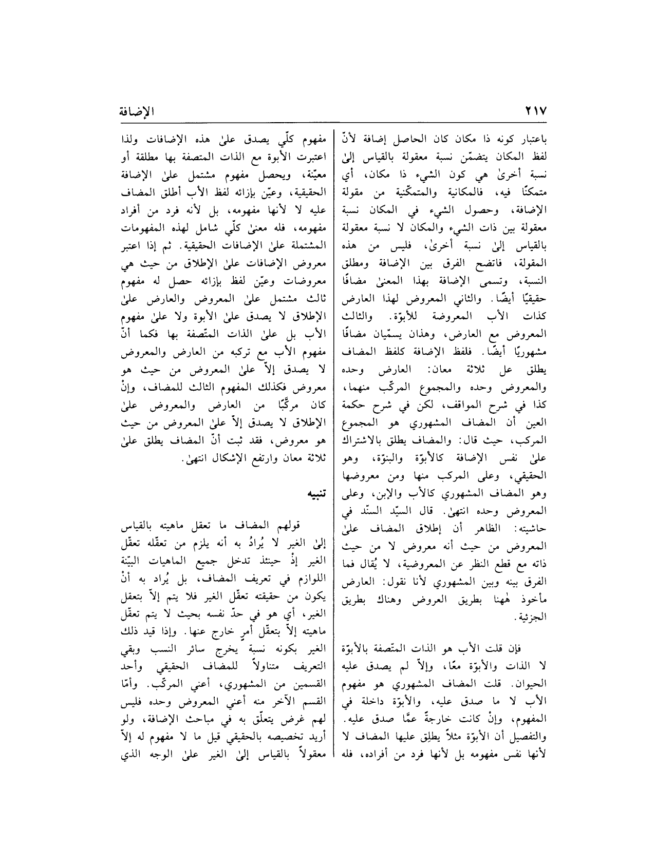 باعتبار كونه ذا مكان كان الحاصل إضافة لأنّ لفظ المكان يتضمّن نسبة معقولة بالقياس إلى نسبة أخرى هي كون الشيء ذا مكان، أي متمكنا فيه، فالمكانية والمتمكّنية من مقولة الإضافة، وحصول الشيء في المكان نسبة معقولة بين ذات الشيء والمكان لا نسبة معقولة بالقياس إلى نسبة أخرى، فليس من هذه المقولة، فاتضح الفرق بين الإضافة ومطلق النسبة، وتسمى الإضافة بهذا المعنى مضافا حقيقيا أيضا. والثاني المعروض لهذا العارض كذات الأب المعروضة للأبوّة. والثالث المعروض مع العارض، وهذان يسمّيان مضافا مشهوريا أيضا. فلفظ الإضافة كلفظ المضاف يطلق عل ثلاثة معان: العارض وحده والمعروض وحده والمجموع المركّب منهما، كذا في شرح المواقف، لكن في شرح حكمة العين أن المضاف المشهوري هو المجموع المركب، حيث قال: والمضاف يطلق بالاشتراك على نفس الإضافة كالأبوّة والبنوّة، وهو الحقيقي، وعلى المركب منها ومن معروضها وهو المضاف المشهوري كالأب والابن، وعلى المعروض وحده انتهى. قال السيّد السّند في حاشيته: الظاهر أن إطلاق المضاف على المعروض من حيث أنه معروض لا من حيث ذاته مع قطع النظر عن المعروضية، لا يقال فما الفرق بينه وبين المشهوري لأنا نقول: العارض مأخوذ هاهنا بطريق العروض وهناك بطريق الجزئية.