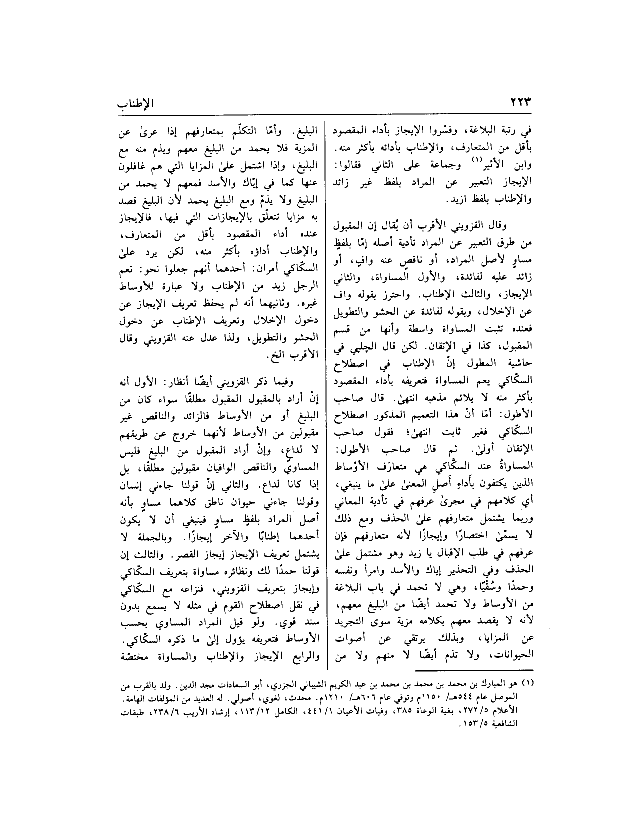 في رتبة البلاغة، وفسّروا الإيجاز بأداء المقصود بأقل من المتعارف، والإطناب بأدائه بأكثر منه.
