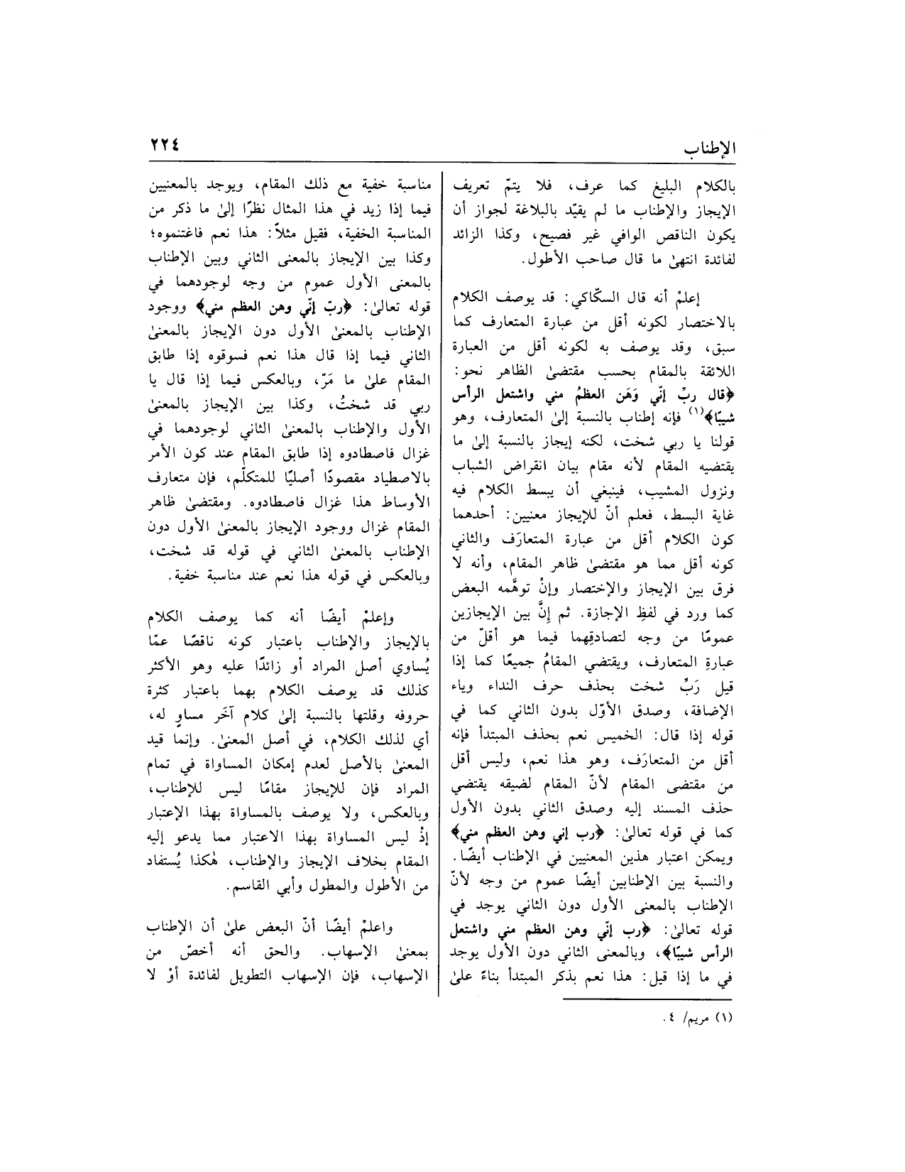 قالَ رَبِّ إِنِّي وَهَنَ الْعَظْمُ مِنِّي وَاشْتَعَلَ الرَّأْسُ شَيْباً «1» فإنه إطناب بالنسبة إلى المتعارف، وهو قولنا يا ربي شخت، لكنه إيجاز بالنسبة إلى ما يقتضيه المقام لأنه مقام بيان انقراض الشباب ونزول المشيب، فينبغي أن يبسط الكلام فيه غاية البسط، فعلم أنّ للإيجاز معنيين: أحدهما كون الكلام أقل من عبارة المتعارف والثاني كونه أقل مما هو مقتضى ظاهر المقام، وأنه لا فرق بين الإيجاز والاختصار وإن توهّمه البعض كما ورد في لفظ الإجازة. ثم إنّ بين الإيجازين عموما من وجه لتصادقهما فيما هو أقلّ من عبارة المتعارف، ويقتضي المقام جميعا كما إذا قيل ربّ شخت بحذف حرف النداء وياء الإضافة، وصدق الأوّل بدون الثاني كما في قوله إذا قال: الخميس نعم بحذف المبتدأ فإنه أقل من المتعارف، وهو هذا نعم، وليس أقل من مقتضى المقام لأنّ المقام لضيقه يقتضي حذف المسند إليه وصدق الثاني بدون الأول كما في قوله تعالى: رَبِّ إِنِّي وَهَنَ الْعَظْمُ مِنِّي ويمكن اعتبار هذين المعنيين في الإطناب أيضا.