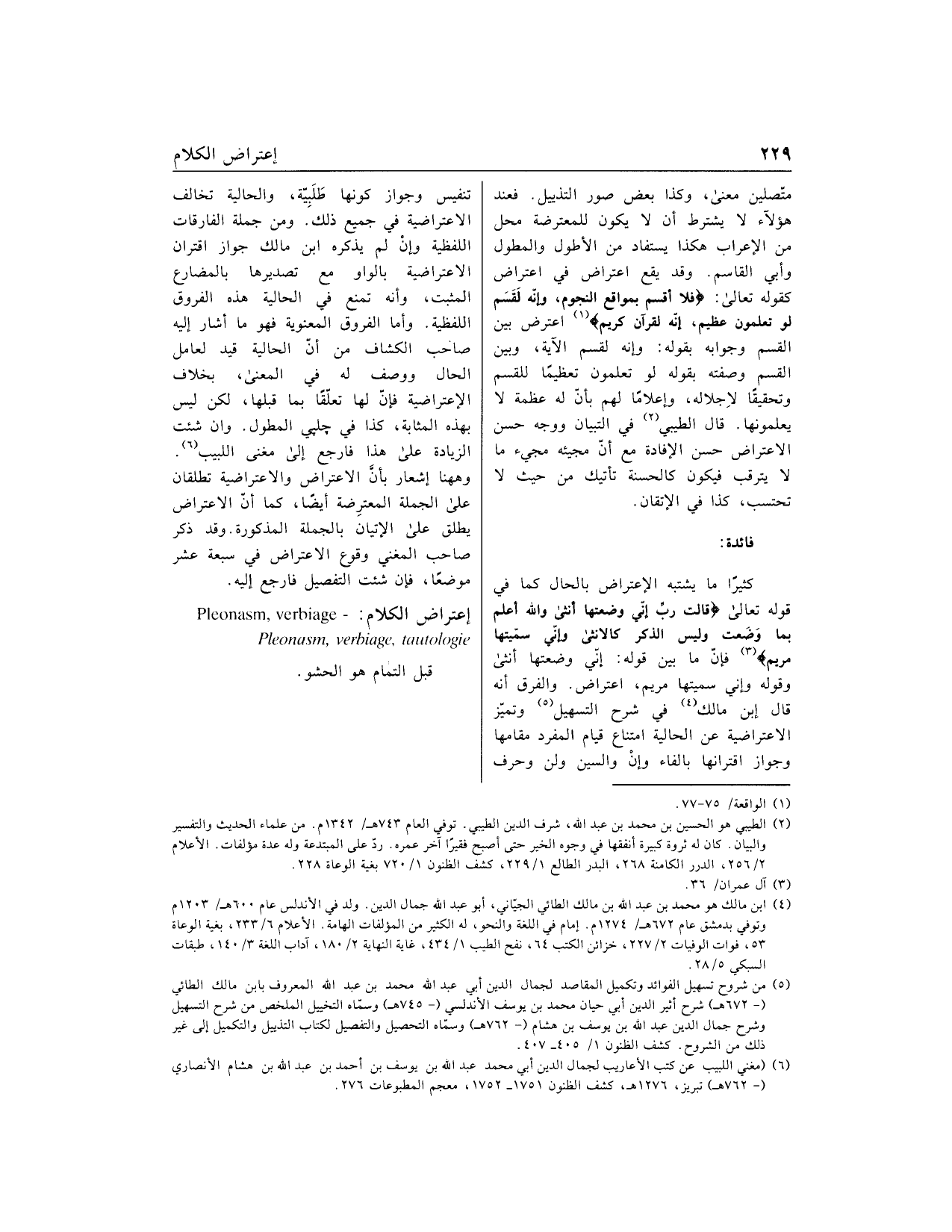 كثيرا ما يشتبه الاعتراض بالحال كما في قوله تعالى قالَتْ رَبِّ إِنِّي وَضَعْتُها أُنْثى وَاللَّهُ أَعْلَمُ بِما وَضَعَتْ وَلَيْسَ الذَّكَرُ كَالْأُنْثى وَإِنِّي سَمَّيْتُها مَرْيَمَ «3» فإنّ ما بين قوله: إِنِّي وَضَعْتُها أُنْثى وقوله وَإِنِّي سَمَّيْتُها مَرْيَمَ، اعتراض. والفرق أنه قال ابن مالك «4» في شرح التسهيل «5» وتميّز الاعتراضية عن الحالية امتناع قيام المفرد مقامها وجواز اقترانها بالفاء وإن والسين ولن وحرف تنفيس وجواز كونها طلبيّة، والحالية تخالف الاعتراضية في جميع ذلك. ومن جملة الفارقات اللفظية وإن لم يذكره ابن مالك جواز اقتران الاعتراضية بالواو مع تصديرها بالمضارع المثبت، وأنه تمنع في الحالية هذه الفروق اللفظية. وأما الفروق المعنوية فهو ما أشار إليه صاحب الكشاف من أنّ الحالية قيد لعامل الحال ووصف له في المعنى، بخلاف الاعتراضية فإنّ لها تعلّقا بما قبلها، لكن ليس بهذه المثابة، كذا في چلپي المطول. وان شئت الزيادة على هذا فارجع إلى مغنى اللبيب «6».