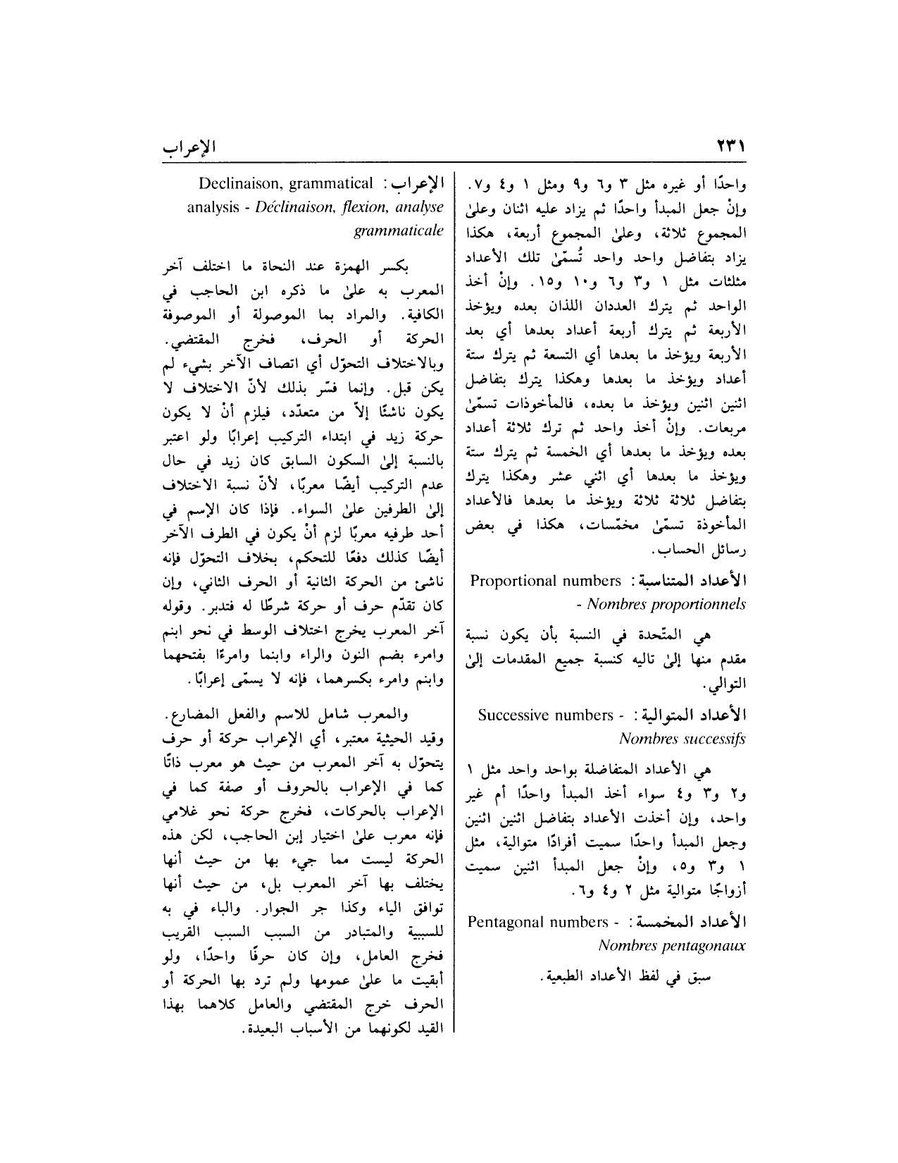 وإن جعل المبدأ واحدا ثم يزاد عليه اثنان وعلى المجموع ثلاثة، وعلى المجموع أربعة، هكذا يزاد بتفاضل واحد واحد تسمّى تلك الأعداد مثلثات مثل 1 و3 و6 و10 و15. وإن أخذ الواحد ثم يترك العددان اللذان بعده ويؤخذ الأربعة ثم يترك أربعة أعداد بعدها أي بعد الأربعة ويؤخذ ما بعدها أي التسعة ثم يترك ستة أعداد ويؤخذ ما بعدها وهكذا يترك بتفاضل اثنين اثنين ويؤخذ ما بعده، فالمأخوذات تسمّى مربعات. وإن أخذ واحد ثم ترك ثلاثة أعداد بعده ويؤخذ ما بعدها أي الخمسة ثم يترك ستة ويؤخذ ما بعدها أي أثني عشر وهكذا يترك بتفاضل ثلاثة ثلاثة ويؤخذ ما بعدها فالأعداد المأخوذة تسمّى مخمّسات، هكذا في بعض رسائل الحساب.