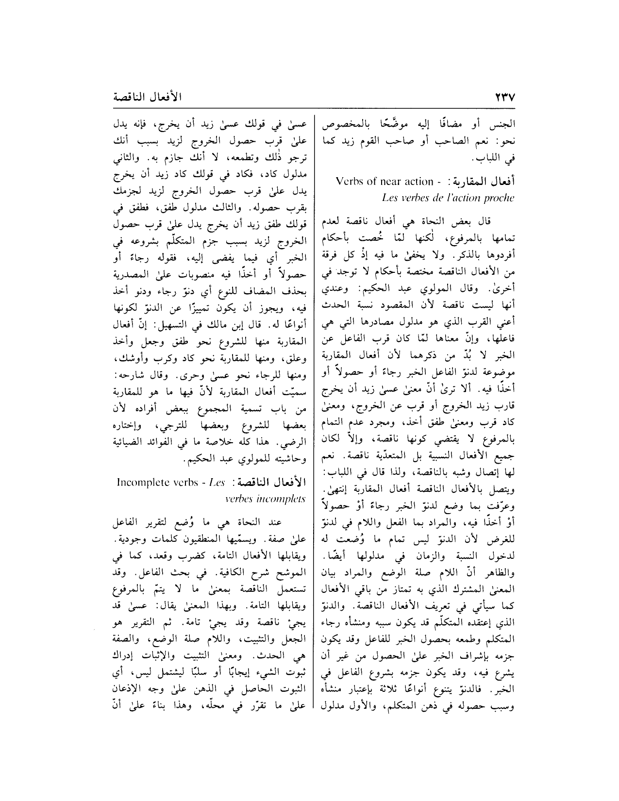 ويقابلها الأفعال التامة، كضرب وقعد، كما في الموشح شرح الكافية. في بحث الفاعل. وقد تستعمل الناقصة بمعنى ما لا يتمّ بالمرفوع ويقابلها التامة. وبهذا المعنى يقال: عسى قد يجيء ناقصة وقد يجيء تامة. ثم التقرير هو الجعل والتثبيت، واللام صلة الوضع، والصفة هي الحدث. ومعنى التثبيت والإثبات إدراك ثبوت الشيء إيجابا أو سلبا ليشتمل ليس، أي الثبوت الحاصل في الذهن على وجه الإذعان على ما تقرّر في محلّه، وهذا بناء على أنّ