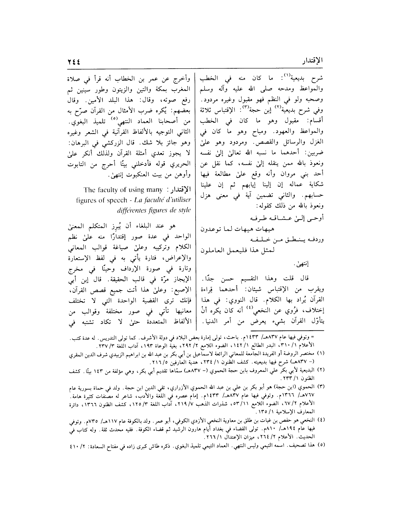 (3) الحموي (ابن حجة) هو أبو بكر بن علي بن عبد الله الحموي الأزراري، تقي الدين ابن حجة. ولد في حماة بسورية عام 767 هـ/ 1366 م. وتوفي فيها عام 837 هـ/ 1433 م. إمام عصره في اللغة والأدب، شاعر له مصنفات كثيرة هامة.