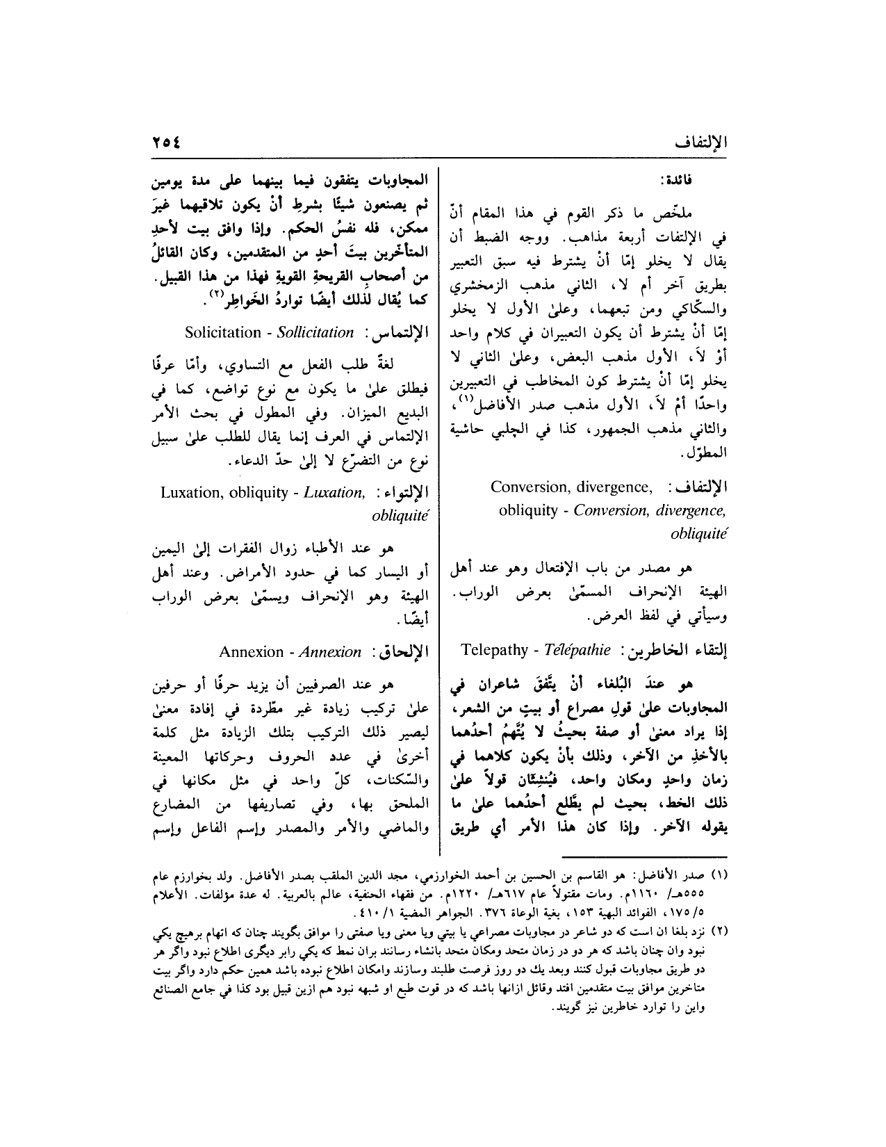 (1) صدر الأفاضل: هو القاسم بن الحسين بن أحمد الخوارزمي، مجد الدين الملقب بصدر الأفاضل. ولد بخوارزم عام 555 هـ/ 1160 م. ومات مقتولا عام 617 هـ/ 1220 م. من فقهاء الحنفية، عالم بالعربية. له عدة مؤلفات. الأعلام 5/ 175، الفوائد البهية 153، بغية الوعاة 376. الجواهر المضية 1/ 410.