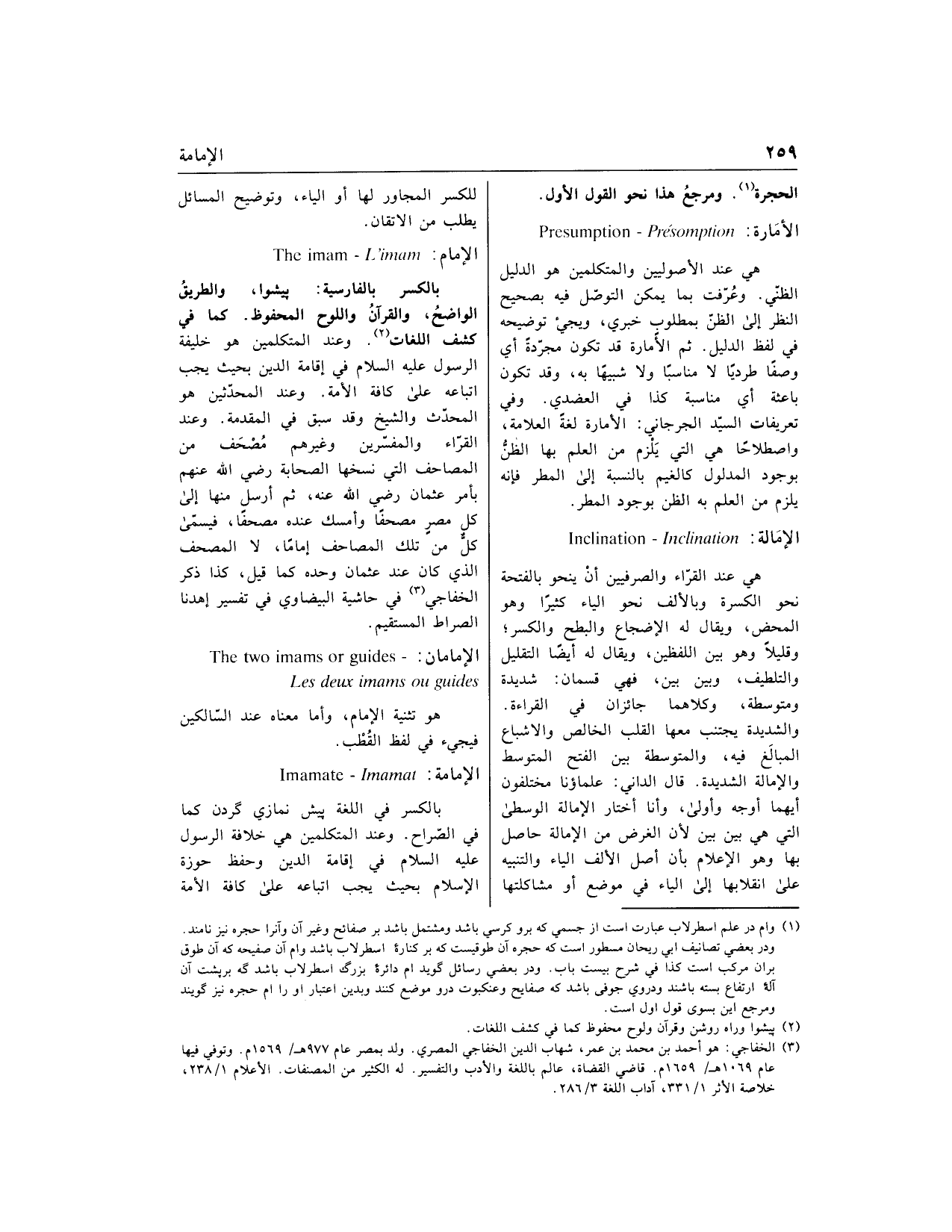 بالكسر بالفارسية: پيشوا، والطريق الواضح، والقرآن واللوح المحفوظ. كما في كشف اللغات «2». وعند المتكلمين هو خليفة الرسول عليه السلام في إقامة الدين بحيث يجب اتباعه على كافة الأمة. وعند المحدّثين هو المحدّث والشيخ وقد سبق في المقدمة. وعند القرّاء والمفسّرين وغيرهم مصحف من المصاحف التي نسخها الصحابة رضي الله عنهم بأمر عثمان رضي الله عنه، ثم أرسل منها إلى كل مصر مصحفا وأمسك عنده مصحفا، فيسمّى كلّ من تلك المصاحف إماما، لا المصحف الذي كان عند عثمان وحده كما قيل، كذا ذكر الخفاجي «3» في حاشية البيضاوي في تفسير اهدنا الصراط المستقيم.