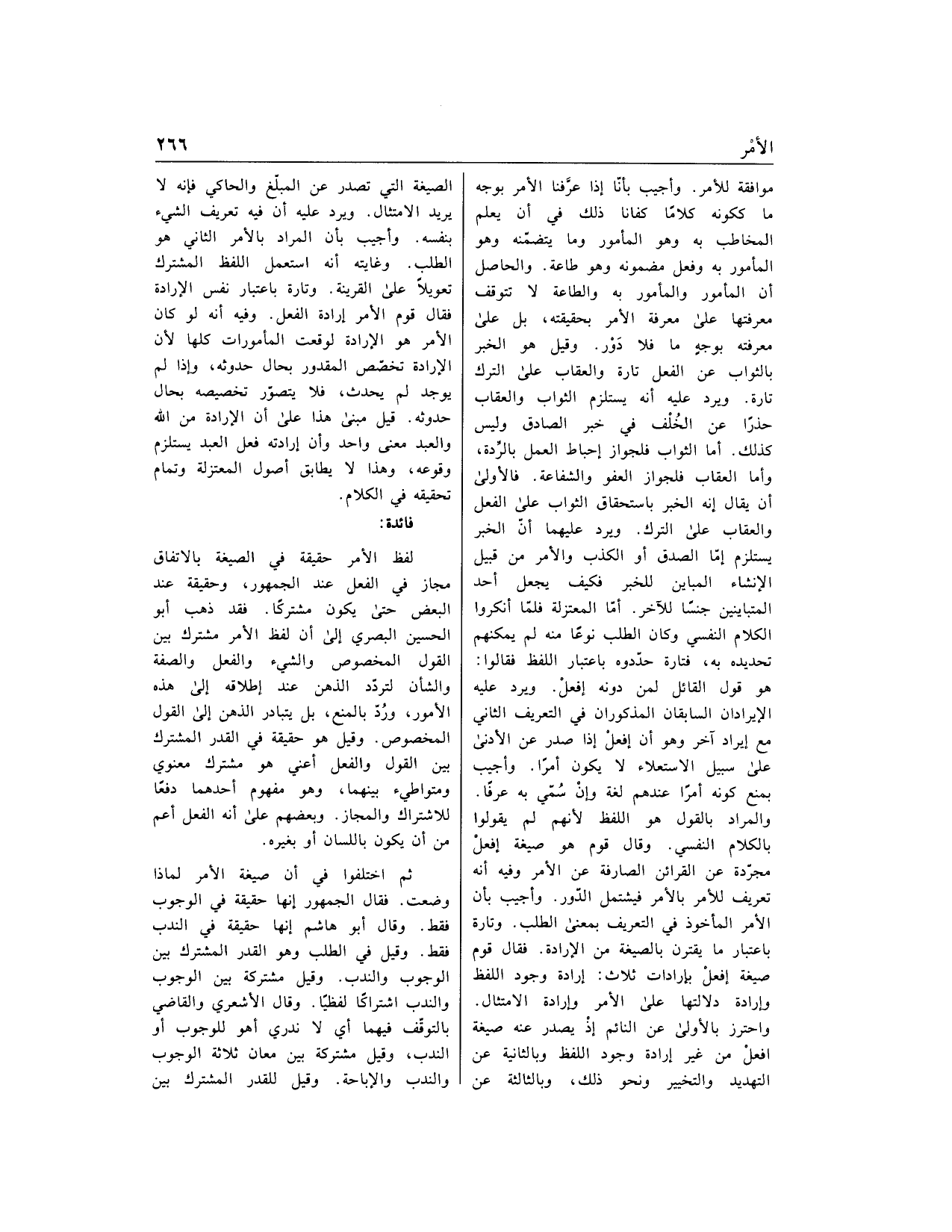 واحترز بالأولى عن النائم إذ يصدر عنه صيغة افعل من غير إرادة وجود اللفظ وبالثانية عن التهديد والتخيير ونحو ذلك، وبالثالثة عن الصيغة التي تصدر عن المبلّغ والحاكي فإنه لا يريد الامتثال. ويرد عليه أن فيه تعريف الشيء بنفسه. وأجيب بأن المراد بالأمر الثاني هو الطلب. وغايته أنه استعمل اللفظ المشترك تعويلا على القرينة. وتارة باعتبار نفس الإرادة فقال قوم الأمر إرادة الفعل. وفيه أنه لو كان الأمر هو الإرادة لوقعت المأمورات كلها لأن الإرادة تخصّص المقدور بحال حدوثه، وإذا لم يوجد لم يحدث، فلا يتصوّر تخصيصه بحال حدوثه. قيل مبنى هذا على أن الإرادة من الله والعبد معنى واحد وأن إرادته فعل العبد يستلزم وقوعه، وهذا لا يطابق أصول المعتزلة وتمام تحقيقه في الكلام.