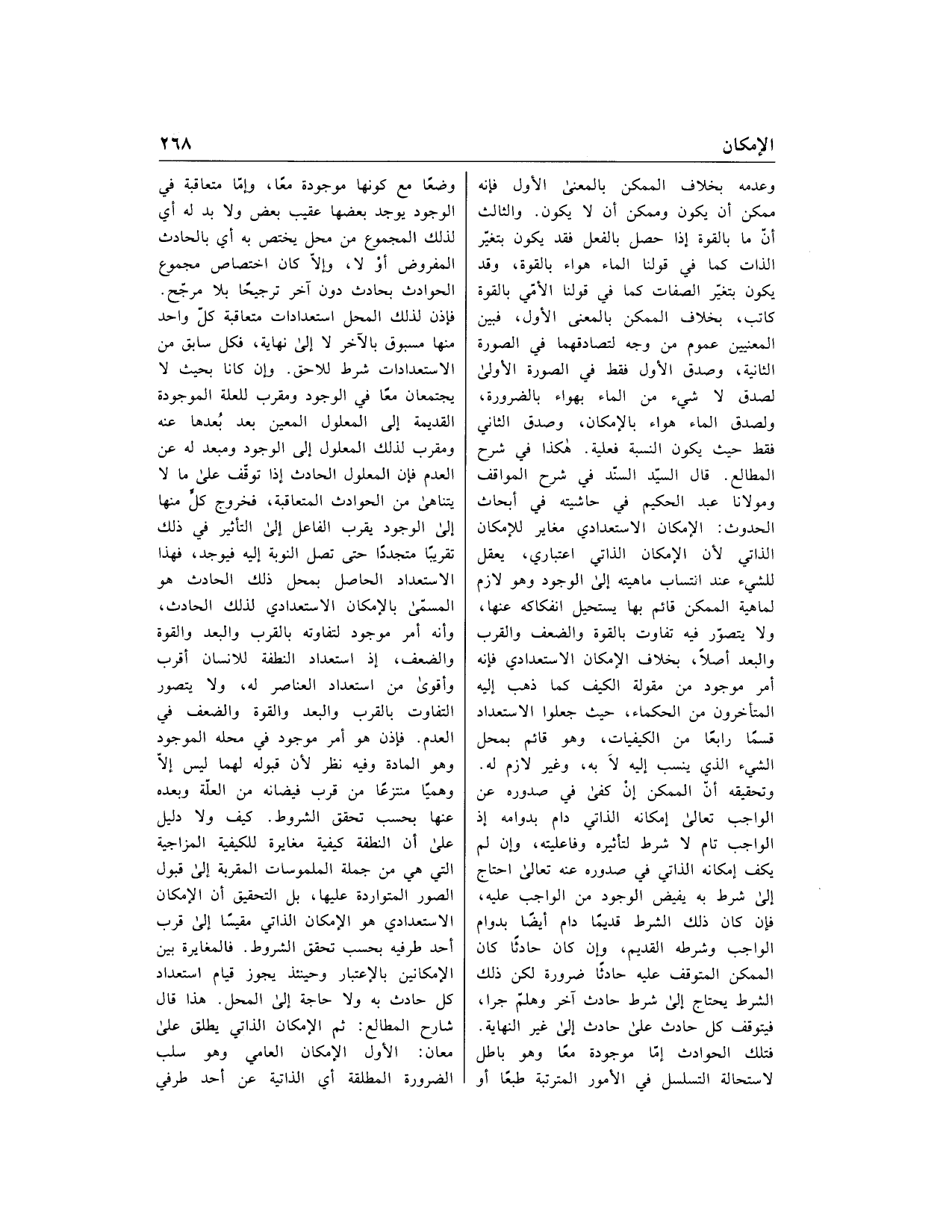 فإذن لذلك المحل استعدادات متعاقبة كلّ واحد منها مسبوق بالآخر لا إلى نهاية، فكل سابق من الاستعدادات شرط للاحق. وإن كانا بحيث لا يجتمعان معا في الوجود ومقرب للعلة الموجودة القديمة إلى المعلول المعين بعد بعدها عنه ومقرب لذلك المعلول إلى الوجود ومبعد له عن العدم فإن المعلول الحادث إذا توقّف على ما لا يتناهى من الحوادث المتعاقبة، فخروج كلّ منها إلى الوجود يقرب الفاعل إلى التأثير في ذلك تقريبا متجددا حتى تصل النوبة إليه فيوجد، فهذا الاستعداد الحاصل بمحل ذلك الحادث هو المسمّى بالإمكان الاستعدادي لذلك الحادث، وأنه أمر موجود لتفاوته بالقرب والبعد والقوة والضعف، إذ استعداد النطفة للانسان أقرب وأقوى من استعداد العناصر له، ولا يتصور التفاوت بالقرب والبعد والقوة والضعف في العدم. فإذن هو أمر موجود في محله الموجود وهو المادة وفيه نظر لأن قبوله لهما ليس إلّا وهميا منتزعا من قرب فيضانه من العلّة وبعده عنها بحسب تحقق الشروط. كيف ولا دليل على أن النطفة كيفية مغايرة للكيفية المزاجية التي هي من جملة الملموسات المقربة إلى قبول الصور المتواردة عليها، بل التحقيق أن الإمكان الاستعدادي هو الإمكان الذاتي مقيسا إلى قرب أحد طرفيه بحسب تحقق الشروط. فالمغايرة بين الإمكانين بالاعتبار وحينئذ يجوز قيام استعداد كل حادث به ولا حاجة إلى المحل. هذا قال شارح المطالع: ثم الإمكان الذاتي يطلق على معان: الأول الإمكان العامي وهو سلب الضرورة المطلقة أي الذاتية عن أحد طرفي