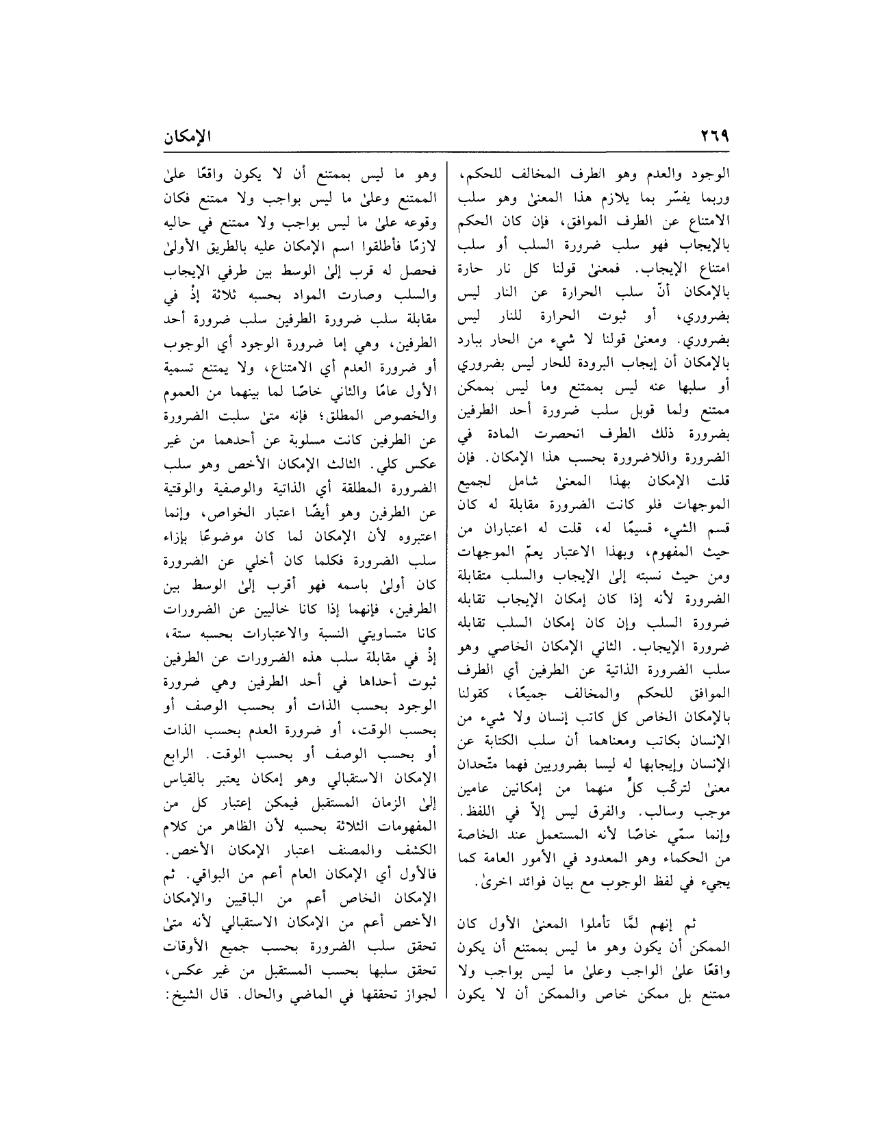 الوجود والعدم وهو الطرف المخالف للحكم، وربما يفسّر بما يلازم هذا المعنى وهو سلب الامتناع عن الطرف الموافق، فإن كان الحكم بالإيجاب فهو سلب ضرورة السلب أو سلب امتناع الإيجاب. فمعنى قولنا كل نار حارة بالإمكان أنّ سلب الحرارة عن النار ليس بضروري، أو ثبوت الحرارة للنار ليس بضروري. ومعنى قولنا لا شيء من الحار ببارد بالإمكان أن إيجاب البرودة للحار ليس بضروري أو سلبها عنه ليس بممتنع وما ليس بممكن ممتنع ولما قوبل سلب ضرورة أحد الطرفين بضرورة ذلك الطرف انحصرت المادة في الضرورة واللاضرورة بحسب هذا الإمكان. فإن قلت الإمكان بهذا المعنى شامل لجميع الموجهات فلو كانت الضرورة مقابلة له كان قسم الشيء قسيما له، قلت له اعتباران من حيث المفهوم، وبهذا الاعتبار يعمّ الموجهات ومن حيث نسبته إلى الإيجاب والسلب متقابلة الضرورة لأنه إذا كان إمكان الإيجاب تقابله ضرورة السلب وإن كان إمكان السلب تقابله ضرورة الإيجاب. الثاني الإمكان الخاصي وهو سلب الضرورة الذاتية عن الطرفين أي الطرف الموافق للحكم والمخالف جميعا، كقولنا بالإمكان الخاص كل كاتب إنسان ولا شيء من الإنسان بكاتب ومعناهما أن سلب الكتابة عن الإنسان وإيجابها له ليسا بضروريين فهما متّحدان معنى لتركّب كلّ منهما من إمكانين عامين موجب وسالب. والفرق ليس إلّا في اللفظ.