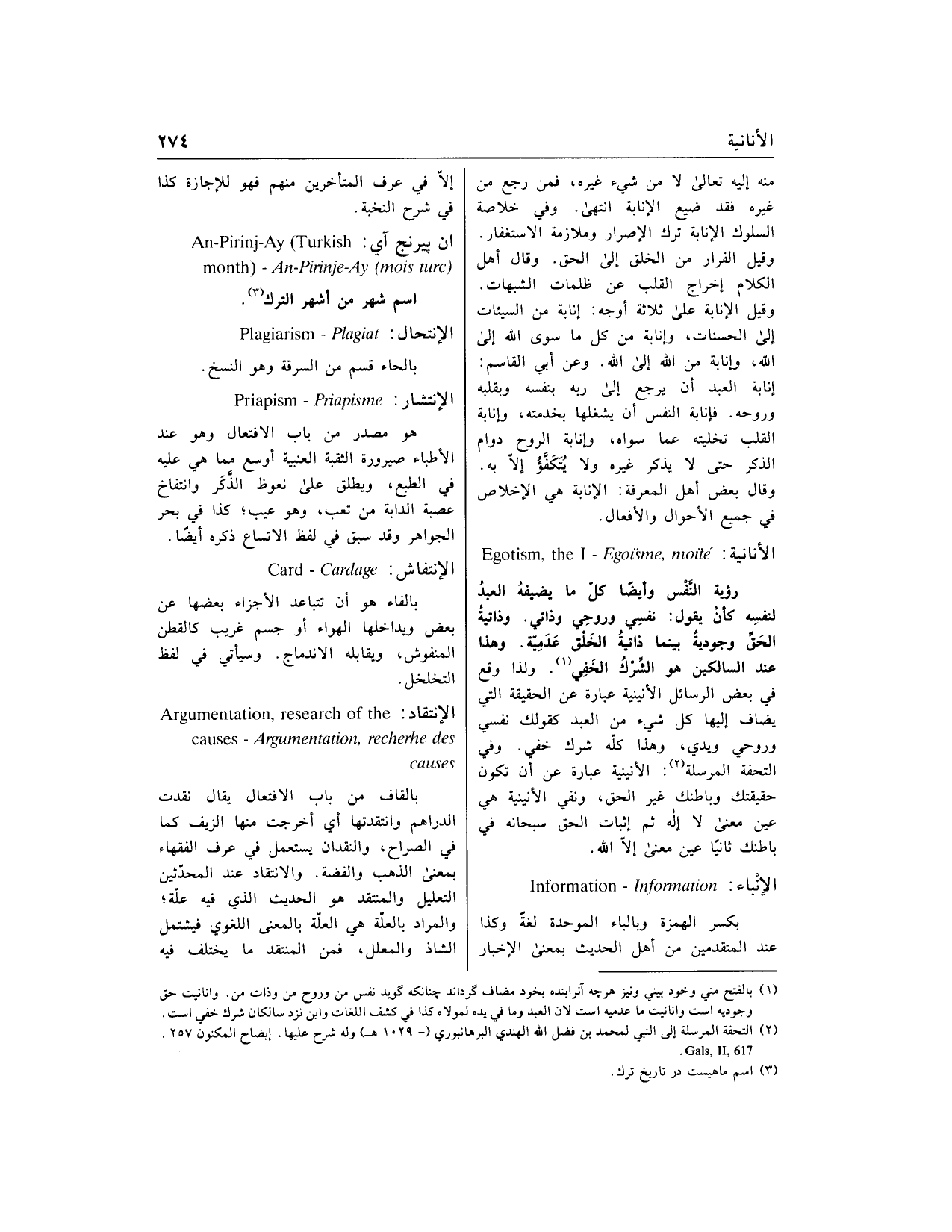 رؤية النّفس وأيضا كلّ ما يضيفه العبد لنفسه كأن يقول: نفسي وروحي وذاتي. وذاتية الحقّ وجودية بينما ذاتية الخلق عدميّة. وهذا عند السالكين هو الشّرك الخفي «1». ولذا وقع في بعض الرسائل الأنينية عبارة عن الحقيقة التي يضاف إليها كل شيء من العبد كقولك نفسي وروحي ويدي، وهذا كلّه شرك خفي. وفي التحفة المرسلة «2»: الأنينية عبارة عن أن تكون حقيقتك وباطنك غير الحق، ونفي الأنينية هي عين معنى لا إله ثم إثبات الحق سبحانه في باطنك ثانيا عين معنى إلّا الله.