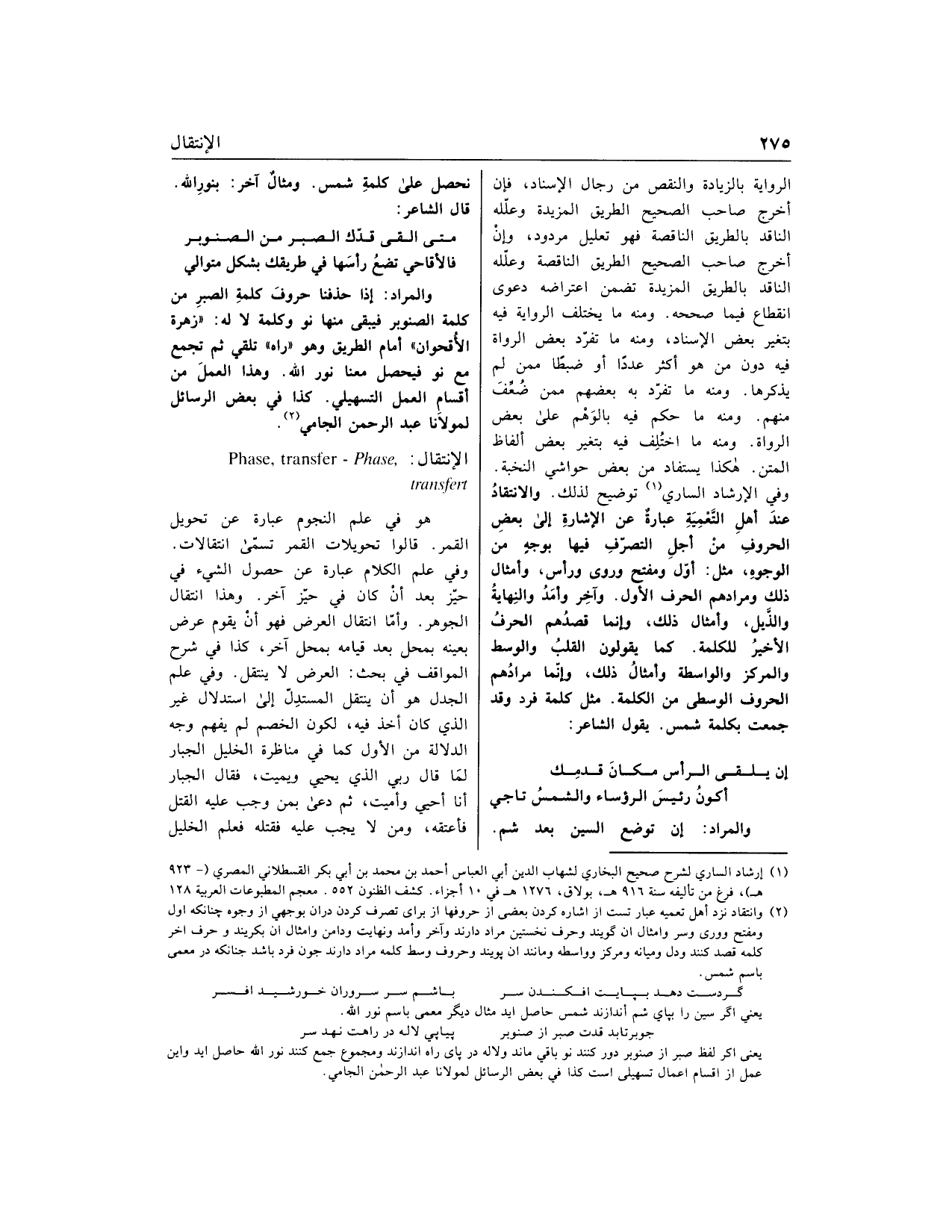 (2) وانتقاد نزد أهل تعميه عبارتست از اشاره كردن بعضى از حروفها از براى تصرف كردن در ان بوجهي از وجوه چنانكه اوّل ومفتح وورى وسر وامثال ان گويند وحرف نخستين مراد دارند وآخر وأمد ونهايت ودامن وامثال ان بكريند وحرف آخر كلمه قصد كنند ودل وميانه ومركز وواسطه ومانند ان پويند وحروف وسط كلمه مراد دارند جون فرد باشد چنانكه در معمى باسم شمس.