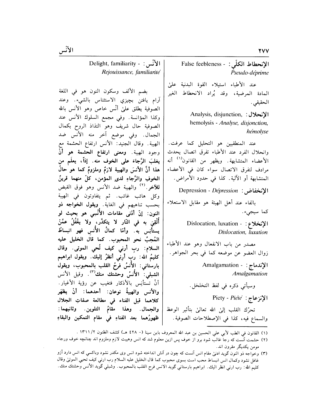 بضم الألف وسكون النون هو في اللغة آرام يافتن به چيزى الاستئناس بالشيء. وعند الصوفية يطلق على أنس خاص وهو الأنس بالله وكذا المؤانسة. وفي مجمع السلوك الأنس عند الصوفية حال شريف وهو التذاذ الروح بكمال الجمال. وفي موضع آخر منه الأنس ضد الهيبة. وقال الجنيد: الأنس ارتفاع الحشمة مع وجود الهيبة. ومعنى ارتفاع الحشمة هو أن يغلب الرّجاء على الخوف منه. إذا، يعلم من هذا أنّ الأنس والهيبة لازم وملزوم كما هو حال الخوف والرّجاء لدى المؤمن، كلّ منهما قرين للآخر. «2» والهيبة ضد الأنس وهو فوق القبض وكل هائب غائب. ثم يتفاوتون في الهيبة بحسب تناهيهم في الغاية. ويقول الخواجه ذو النون: إنّ أدنى مقامات الأنسي هو بحيث لو ألقي به في النّار لا يتكدّر، ولا يغفل عمّن يستأنس به. وأمّا كمال الأنس فهو انبساط المحبّ نحو المحبوب. كما قال الخليل عليه السلام: رب أرني كيف تحي الموتى. وقال كليم الله: رب أرني أنظر إليك. ويقول ابراهيم بارستاني: الأنس فرح القلب بالمحبوب، ويقول الشبلي: الأنس وحشتك منك «3». وقيل الأنس أن تستأنس بالأذكار فتغيب عن رؤية الأغيار.