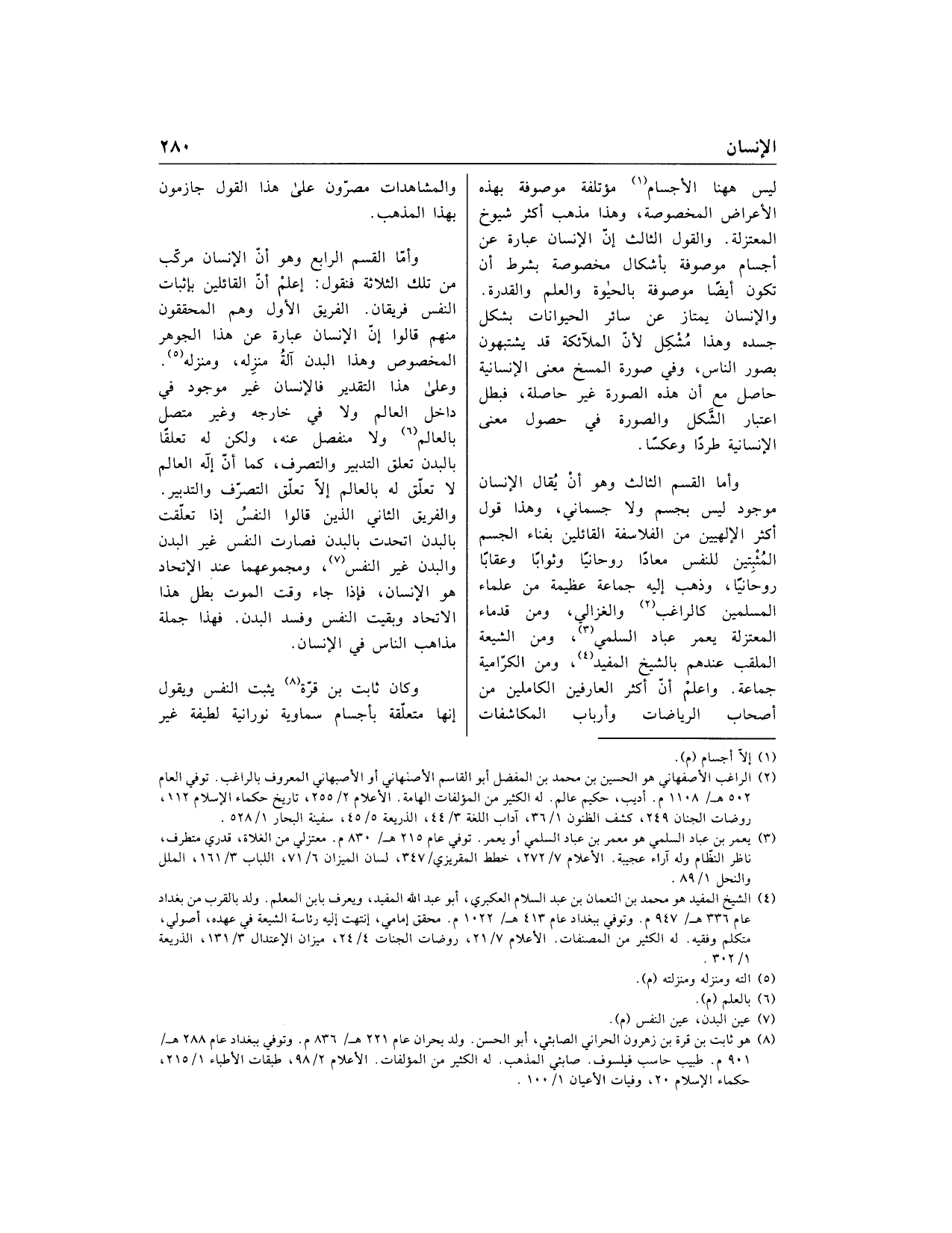 وأما القسم الثالث وهو أن يقال الإنسان موجود ليس بجسم ولا جسماني، وهذا قول أكثر الإلهيين من الفلاسفة القائلين بفناء الجسم المثبتين للنفس معادا روحانيا وثوابا وعقابا روحانيا، وذهب إليه جماعة عظيمة من علماء المسلمين كالراغب «2» والغزالي، ومن قدماء المعتزلة يعمر عباد السلمي «3»، ومن الشيعة الملقب عندهم بالشيخ المفيد «4»، ومن الكرّامية جماعة. واعلم أنّ أكثر العارفين الكاملين من أصحاب الرياضات وأرباب المكاشفات والمشاهدات مصرّون على هذا القول جازمون بهذا المذهب.