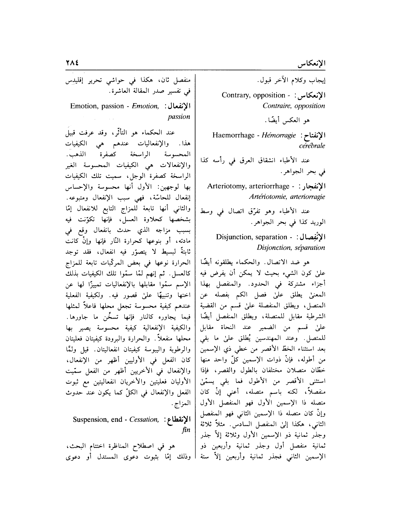 هو ضد الاتصال. والحكماء يطلقونه أيضا على كون الشيء بحيث لا يمكن أن يفرض فيه أجزاء مشتركة في الحدود. والمنفصل بهذا المعنى يطلق على فصل الكم بفصله عن المتصل، ويطلق المنفصلة على قسم من القضية الشرطية مقابل للمتصلة، ويطلق المنفصل أيضا على قسم من الضمير عند النحاة مقابل للمتصل. وعند المهندسين يطلق على ما بقي بعد استثناء الخطّ الأقصر من خطي ذي الاسمين من أطوله، فإنّ ذوات الاسمين كلّ واحد منها خطّان متصلان مختلفان بالطول والقصر، فإذا استثنى الأقصر من الأطول فما بقي يسمّى منفصلا، لكنه باسم متصله، أعني إن كان متصله ذا الاسمين الأول فهو المنفصل الأول وإن كان متصله ذا الاسمين الثاني فهو المنفصل الثاني، هكذا إلى المنفصل السادس. مثلا ثلاثة وجذر ثمانية ذو الاسمين الأول وثلاثة إلّا جذر ثمانية منفصل أول وجذر ثمانية وأربعين ذو الاسمين الثاني فجذر ثمانية وأربعين إلّا ستة منفصل ثان، هكذا في حواشي تحرير أقليدس في تفسير صدر المقالة العاشرة.