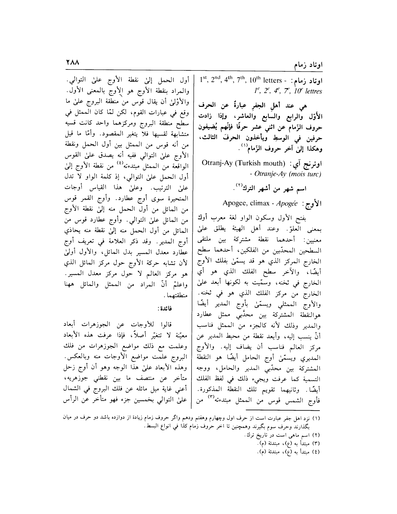 والأولى أن يقال قوس من منطقة البروج على ما وقع في عبارات القوم، لكن لمّا كان الممثل في سطح منطقة البروج ومركزهما واحد كانت قسيه متشابهة لقسيها فلا يتغير المقصود. وأمّا ما قيل من أنه قوس من الممثل بين أول الحمل ونقطة الأوج على التوالي ففيه أنه يصدق على القوس الواقعة من الممثل مبتدؤه «4» من نقطة الأوج إلى أول الحمل على التوالي، إذ كلمة الواو لا تدل على الترتيب. وعلى هذا القياس أوجات المتحيرة سوى أوج عطارد. وأوج القمر قوس من المائل من أول الحمل منه إلى نقطة الأوج من المائل على التوالي. وأوج عطارد قوس من المائل من أول الحمل منه إلى نقطة منه يحاذي أوج المدير. وقد ذكر العلامة في تعريف أوج عطارد معدل المسير بدل المائل، والأول أولى لأن تشابه حركة الأوج حول مركز المائل الذي هو مركز العالم لا حول مركز معدل المسير.