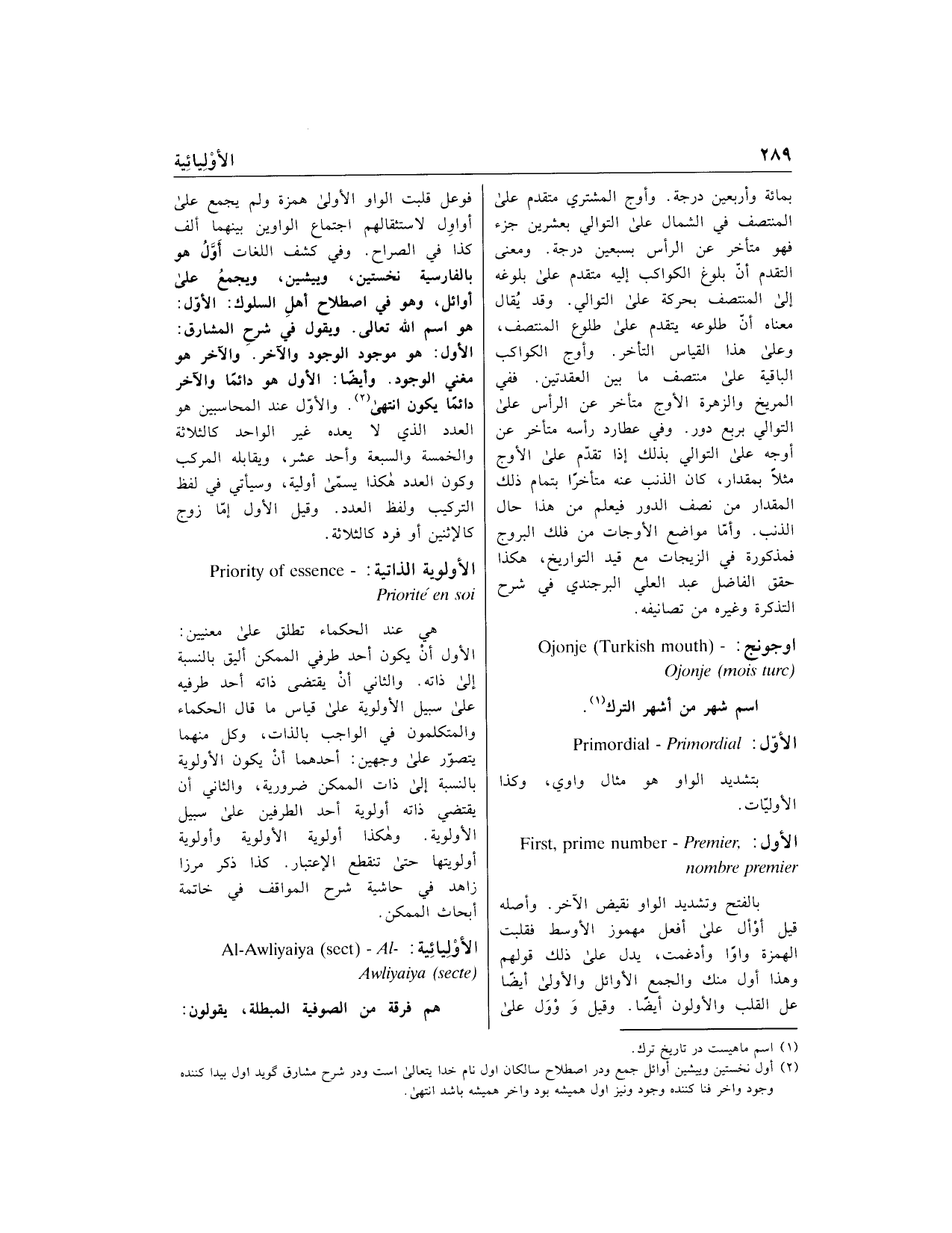 الأول: هو موجود الوجود والآخر. والآخر هو مغني الوجود، وأيضا: الأول هو دائما والآخر دائما يكون انتهى «2». والأوّل عند المحاسبين هو العدد الذي لا يعده غير الواحد كالثلاثة والخمسة والسبعة وأحد عشر، ويقابله المركب وكون العدد هكذا يسمّى أولية، وسيأتي في لفظ التركيب ولفظ العدد. وقيل الأول إمّا زوج كالإثنين أو فرد كالثلاثة.