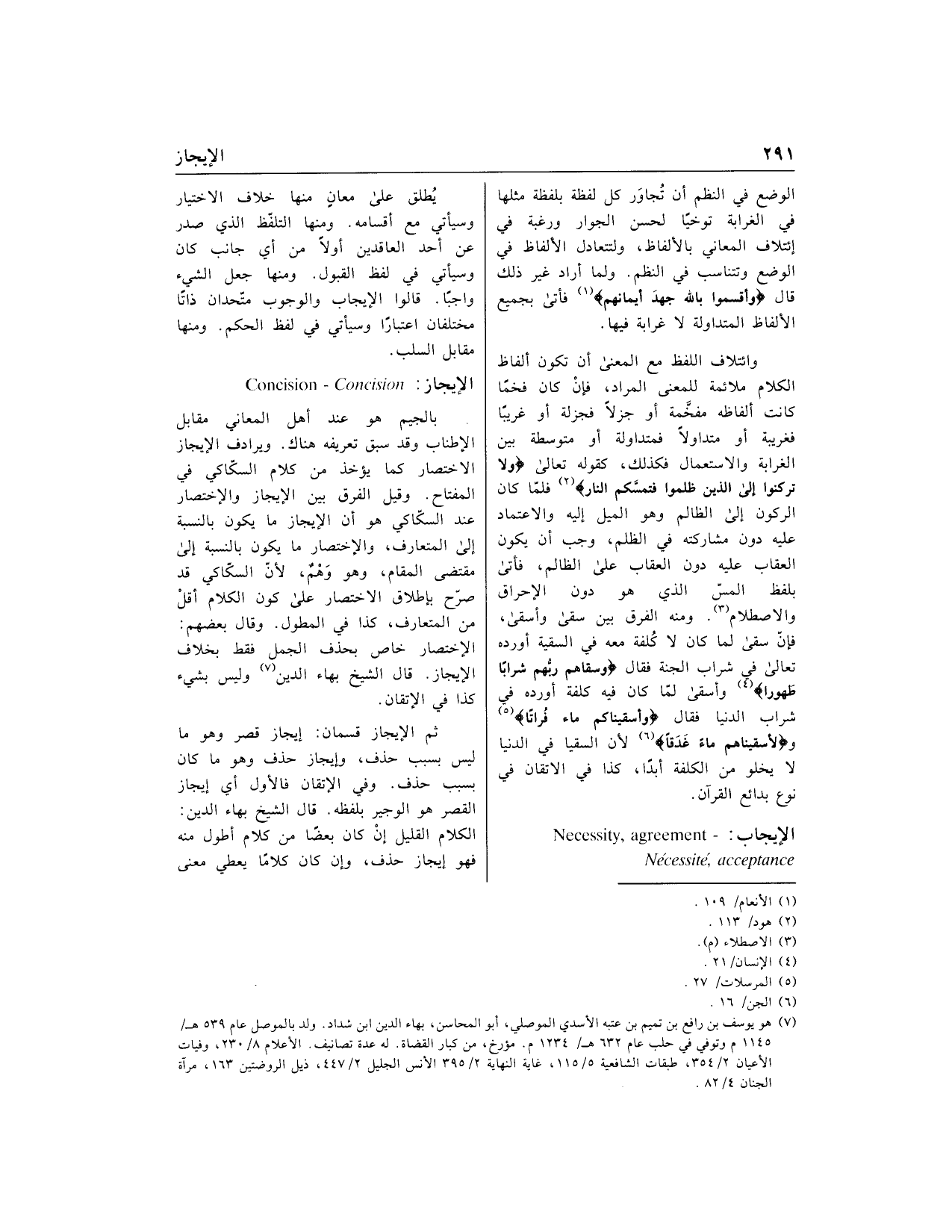 ثم الإيجاز قسمان: إيجاز قصر وهو ما ليس بسبب حذف، وإيجاز حذف وهو ما كان بسبب حذف. وفي الإتقان فالأول أي إيجاز القصر هو الوجير بلفظه. قال الشيخ بهاء الدين: