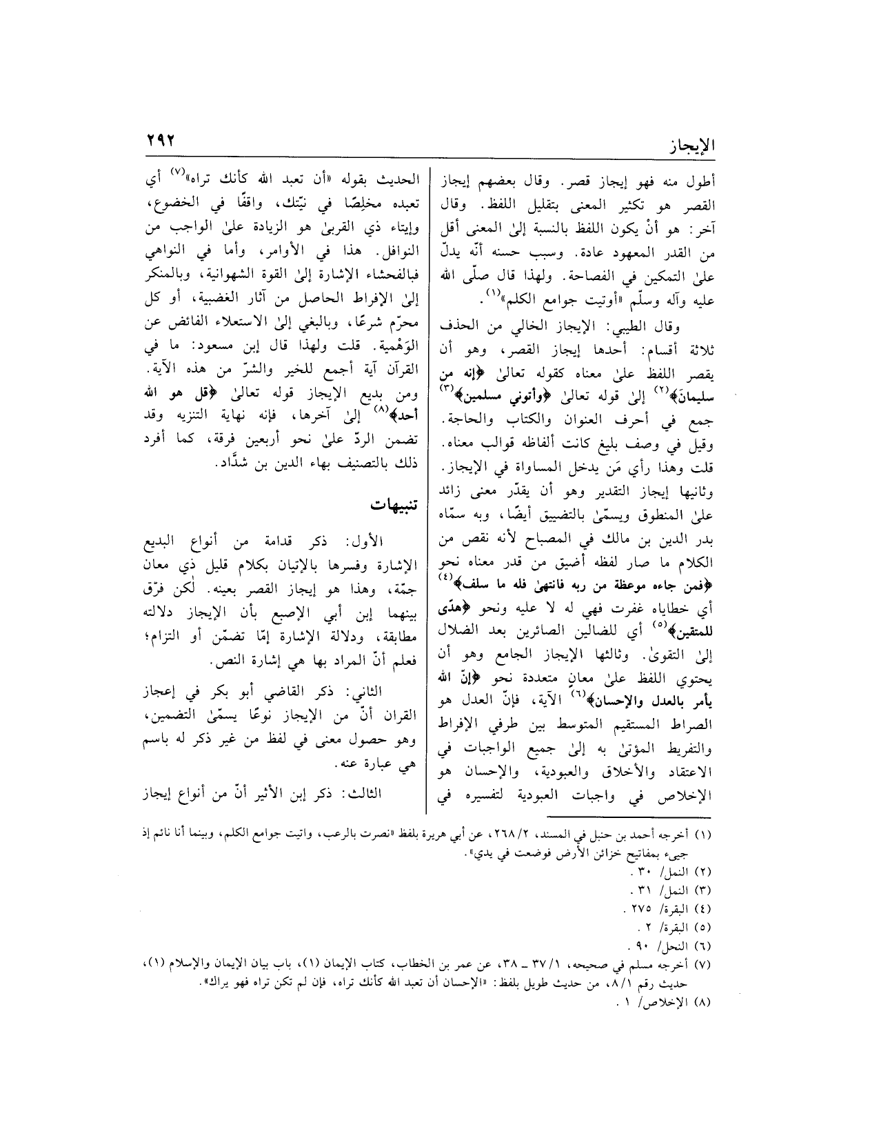 وثانيها إيجاز التقدير وهو أن يقدّر معنى زائد على المنطوق ويسمّى بالتضييق أيضا، وبه سمّاه بدر الدين بن مالك في المصباح لأنه نقص من الكلام ما صار لفظه أضيق من قدر معناه نحو فَمَنْ جاءَهُ مَوْعِظَةٌ مِنْ رَبِّهِ فَانْتَهى فَلَهُ ما سَلَفَ «4» أي خطاياه غفرت فهي له لا عليه ونحو هُدىً لِلْمُتَّقِينَ «5» أي للضالين الصائرين بعد الضلال إلى التقوى. وثالثها الإيجاز الجامع وهو أن يحتوي اللفظ على معان متعددة نحو إِنَّ اللَّهَ يَأْمُرُ بِالْعَدْلِ وَالْإِحْسانِ «6» الآية، فإنّ العدل هو الصراط المستقيم المتوسط بين طرفي الإفراط والتفريط المؤتى به إلى جميع الواجبات في الاعتقاد والأخلاق والعبودية، والإحسان هو الإخلاص في واجبات العبودية لتفسيره في الحديث بقوله «أن تعبد الله كأنك تراه» «7» أي تعبده مخلصا في نيّتك، واقفا في الخضوع، وإيتاء ذي القربى هو الزيادة على الواجب من النوافل. هذا في الأوامر، وأما في النواهي فبالفحشاء الإشارة إلى القوة الشهوانية، وبالمنكر إلى الإفراط الحاصل من آثار الغضبية، أو كل محرّم شرعا، وبالبغي إلى الاستعلاء الفائض عن الوهمية. قلت ولهذا قال ابن مسعود: ما في القرآن آية أجمع للخير والشرّ من هذه الآية.