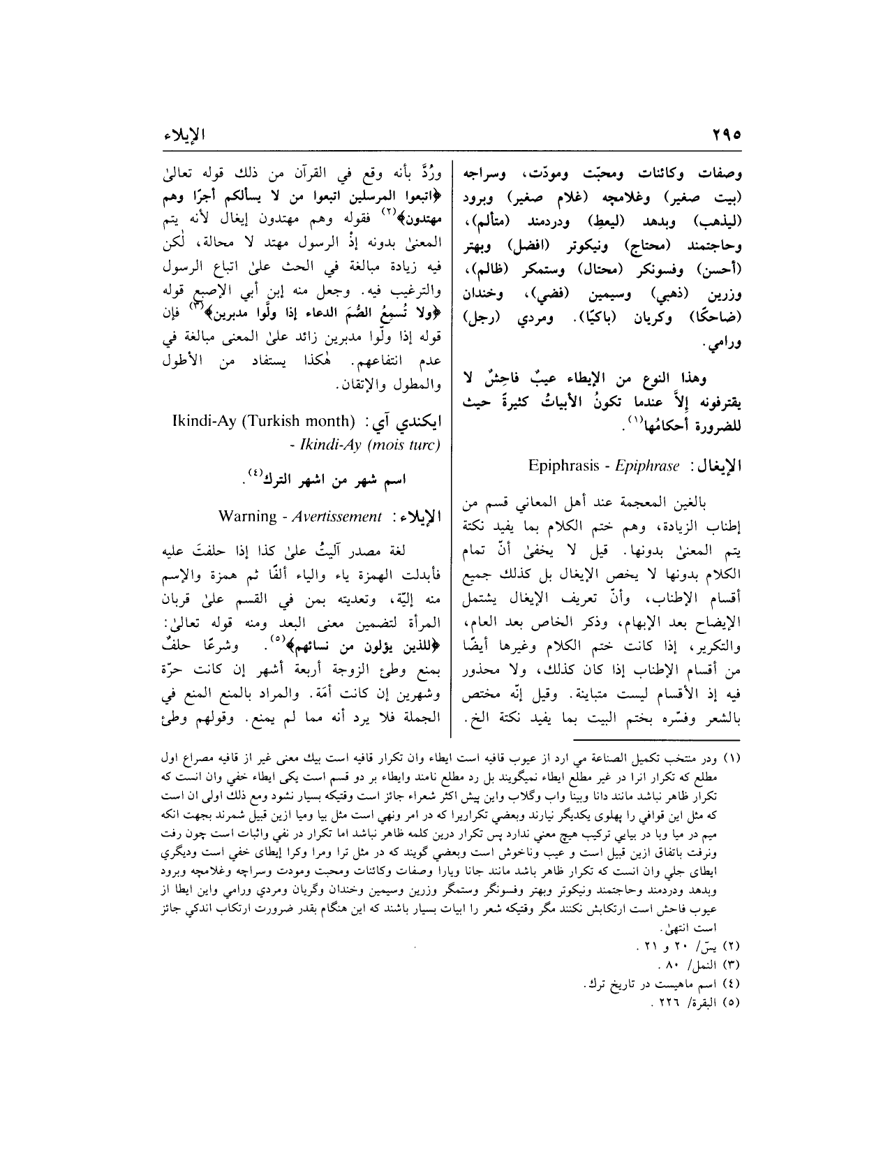 وردّ بأنه وقع في القرآن من ذلك قوله تعالى اتَّبِعُوا الْمُرْسَلِينَ اتَّبِعُوا مَنْ لا يَسْئَلُكُمْ أَجْراً وَهُمْ مُهْتَدُونَ «2» فقوله وَهُمْ مُهْتَدُونَ إيغال لأنه يتم المعنى بدونه إذ الرسول مهتد لا محالة، لكن فيه زيادة مبالغة في الحث على اتباع الرسول والترغيب فيه. وجعل منه ابن أبي الإصبع قوله وَلا تُسْمِعُ الصُّمَّ الدُّعاءَ إِذا وَلَّوْا مُدْبِرِينَ «3» فإن قوله إِذا وَلَّوْا مُدْبِرِينَ زائد على المعنى مبالغة في عدم انتفاعهم. هكذا يستفاد من الأطول والمطول والإتقان.