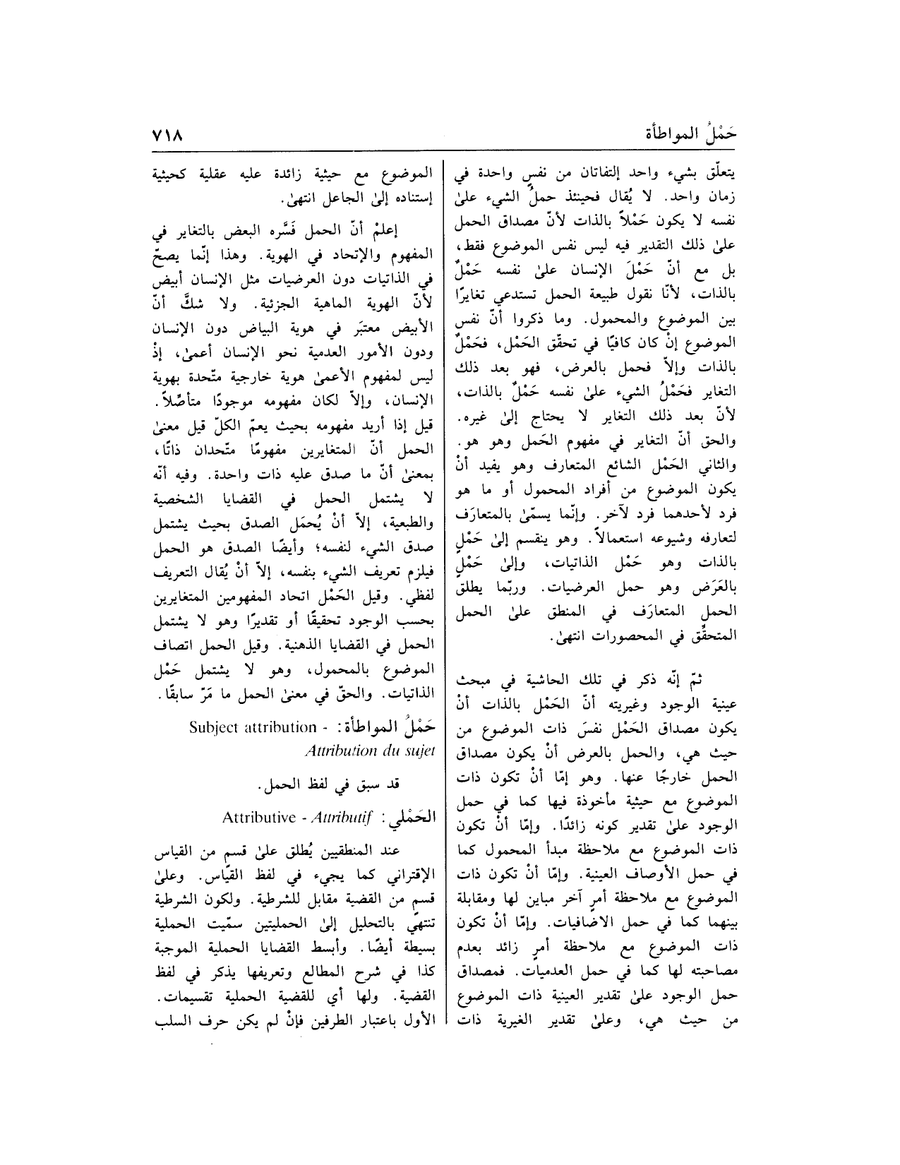 اعلم أنّ الحمل فسّره البعض بالتغاير في المفهوم والاتحاد في الهوية. وهذا إنّما يصحّ في الذاتيات دون العرضيات مثل الإنسان أبيض لأنّ الهوية الماهية الجزئية. ولا شكّ أنّ الأبيض معتبر في هوية البياض دون الإنسان ودون الأمور العدمية نحو الإنسان أعمى، إذ ليس لمفهوم الأعمى هوية خارجية متّحدة بهوية الإنسان، وإلّا لكان مفهومه موجودا متأصّلا.