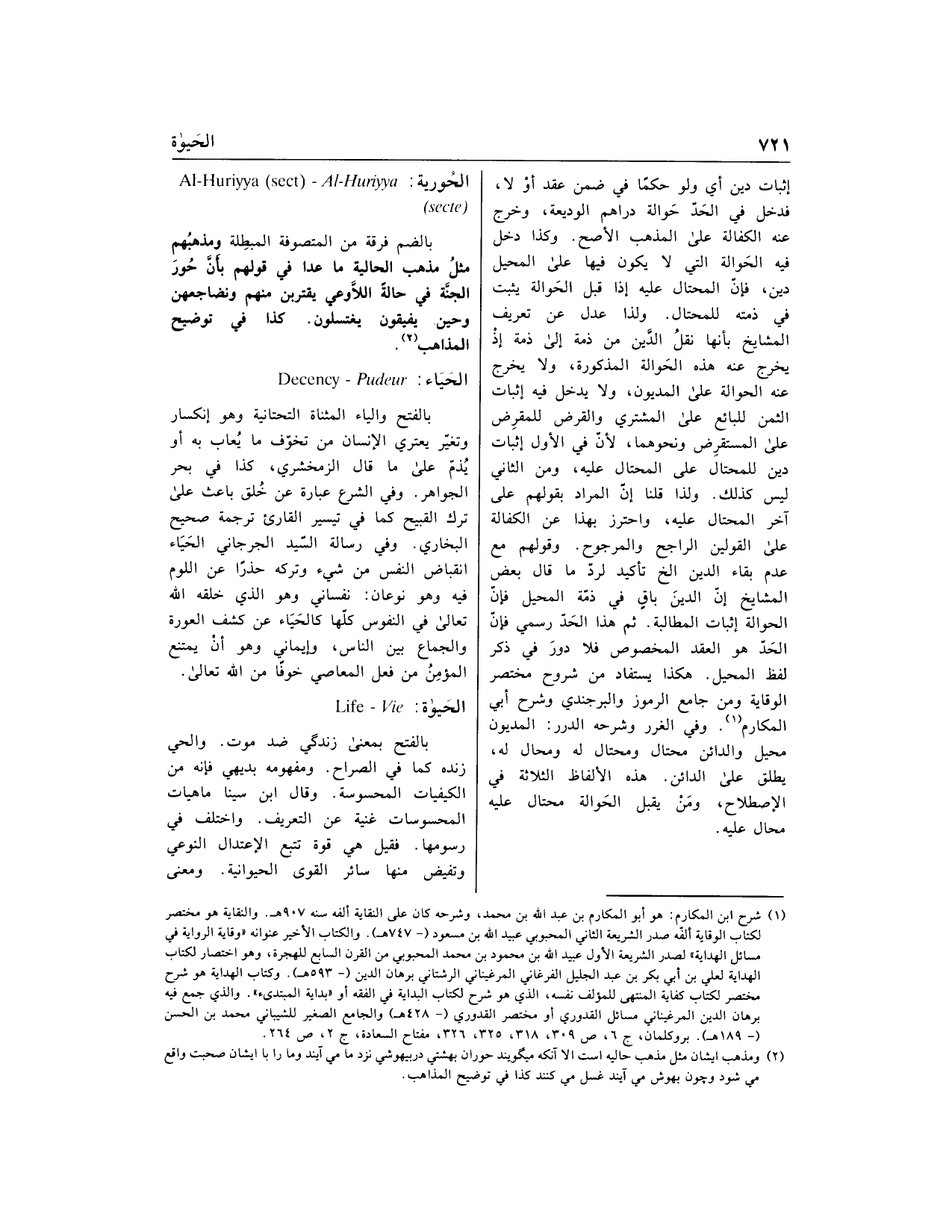 (1) شرح ابن المكارم: هو أبو المكارم بن عبد الله بن محمد، وشرحه كان على النقاية ألفه سنه 907 هـ. والنقاية هو مختصر لكتاب الوقاية ألّفه صدر الشريعة الثاني المحبوبي عبيد الله بن مسعود (- 747 هـ). والكتاب الأخير عنوانه «وقاية الرواية في مسائل الهداية» لصدر الشريعة الأول عبيد الله بن محمود بن محمد المحبوبي من القرن السابع للهجرة، وهو اختصار لكتاب الهداية لعلي بن أبي بكر بن عبد الجليل الفرغاني المرغيناني الرشتاني برهان الدين (- 593 هـ). وكتاب الهداية هو شرح مختصر لكتاب كفاية المنتهى للمؤلف نفسه، الذي هو شرح لكتاب البداية في الفقه أو «بداية المبتدئ». والذي جمع فيه برهان الدين المرغيناني مسائل القدوري أو مختصر القدوري (- 428 هـ) والجامع الصغير للشيباني محمد بن الحسن (- 189 هـ). بروكلمان، ج 6، ص 309، 318، 325، 326، مفتاح السعادة، ج 2، ص 264.