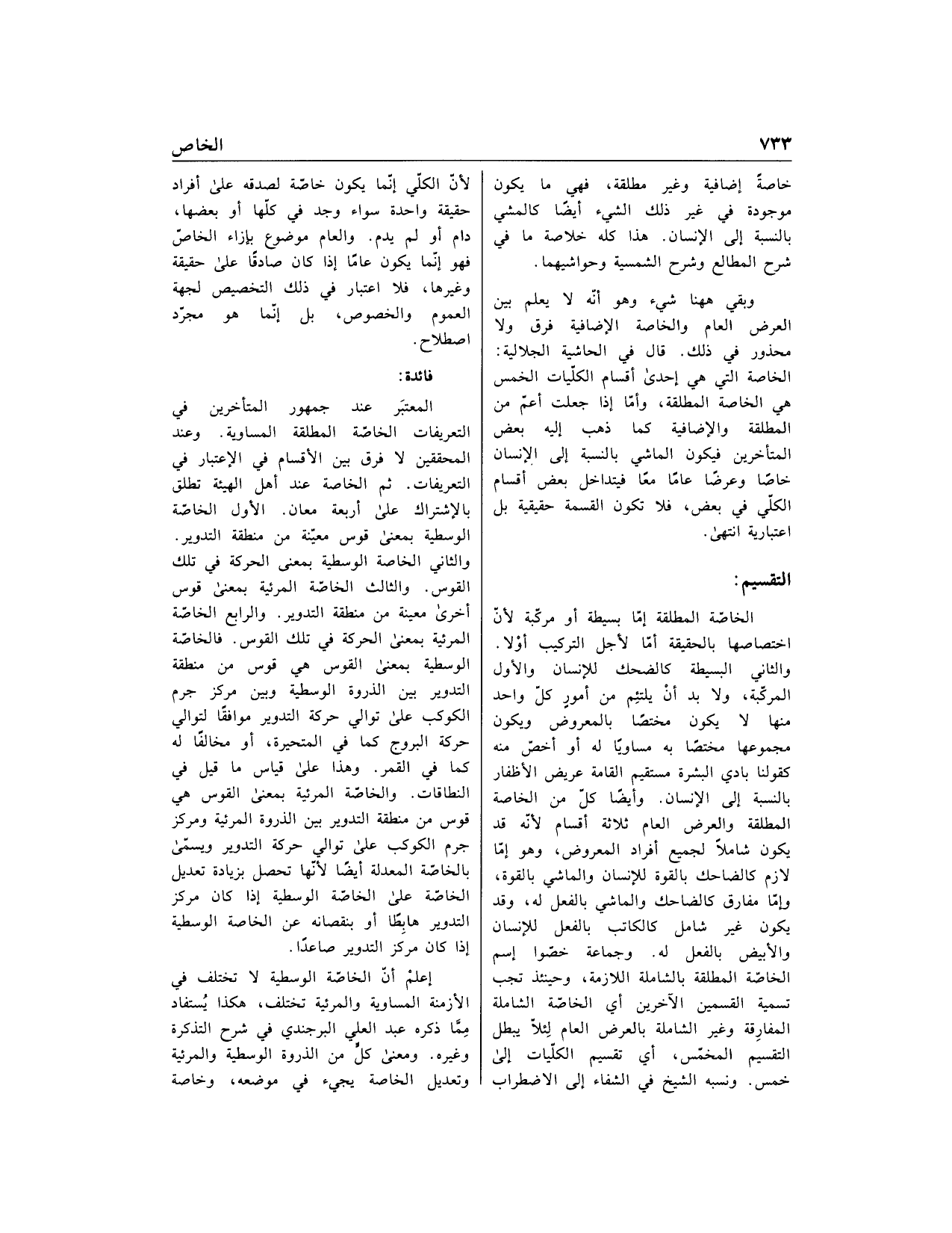 المعتبر عند جمهور المتأخرين في التعريفات الخاصّة المطلقة المساوية. وعند المحققين لا فرق بين الأقسام في الاعتبار في التعريفات. ثم الخاصة عند أهل الهيئة تطلق بالاشتراك على أربعة معان. الأول الخاصّة الوسطية بمعنى قوس معيّنة من منطقة التدوير.