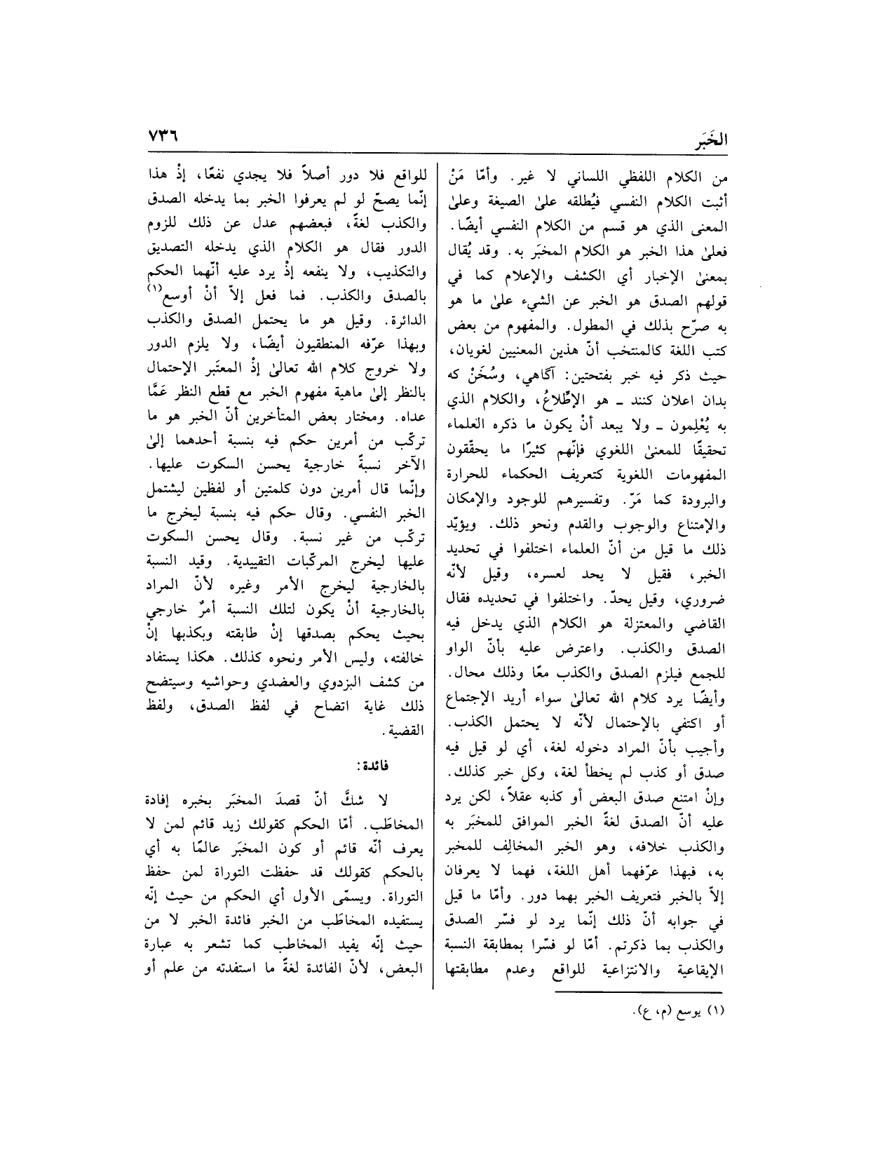 فعلى هذا الخبر هو الكلام المخبر به. وقد يقال بمعنى الإخبار أي الكشف والإعلام كما في قولهم الصدق هو الخبر عن الشيء على ما هو به صرّح بذلك في المطول. والمفهوم من بعض كتب اللغة كالمنتخب أنّ هذين المعنيين لغويان، حيث ذكر فيه خبر بفتحتين: آگاهى، وسخن كه بدان اعلان كنند- هو الاطّلاع، والكلام الذي به يعلمون- ولا يبعد أن يكون ما ذكره العلماء تحقيقا للمعنى اللغوي فإنّهم كثيرا ما يحقّقون المفهومات اللغوية كتعريف الحكماء للحرارة والبرودة كما مرّ. وتفسيرهم للوجود والإمكان والامتناع والوجوب والقدم ونحو ذلك. ويؤيّد ذلك ما قيل من أنّ العلماء اختلفوا في تحديد الخبر، فقيل لا يحد لعسره، وقيل لأنّه ضروري، وقيل يحدّ. واختلفوا في تحديده فقال القاضي والمعتزلة هو الكلام الذي يدخل فيه الصدق والكذب. واعترض عليه بأنّ الواو للجمع فيلزم الصدق والكذب معا وذلك محال.