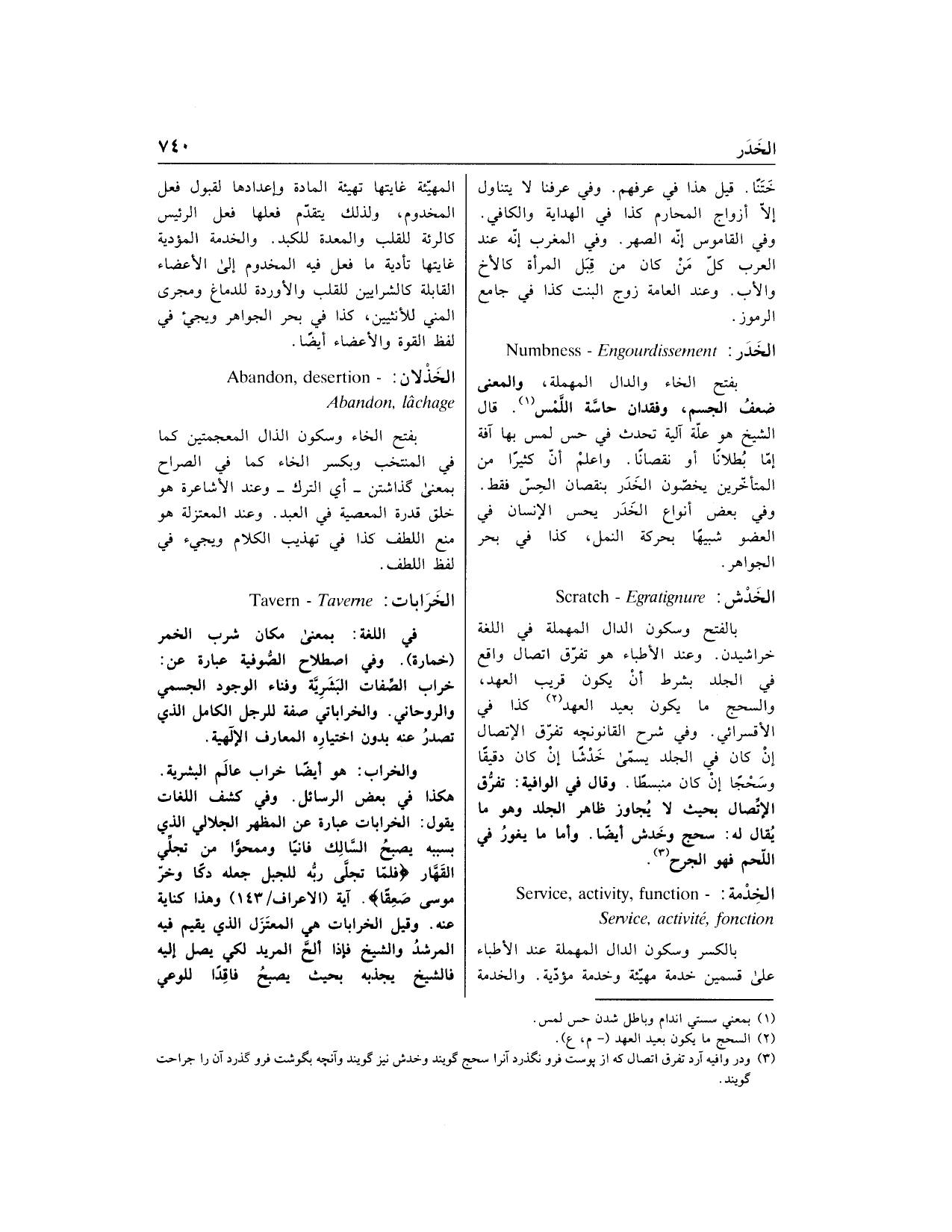 بفتح الخاء والدال المهملة، والمعنى ضعف الجسم، وفقدان حاسّة اللّمس «1». قال الشيخ هو علّة آلية تحدث في حس لمس بها آفة إمّا بطلانا أو نقصانا. واعلم أنّ كثيرا من المتأخّرين يخصّون الخدر بنقصان الحسّ فقط.