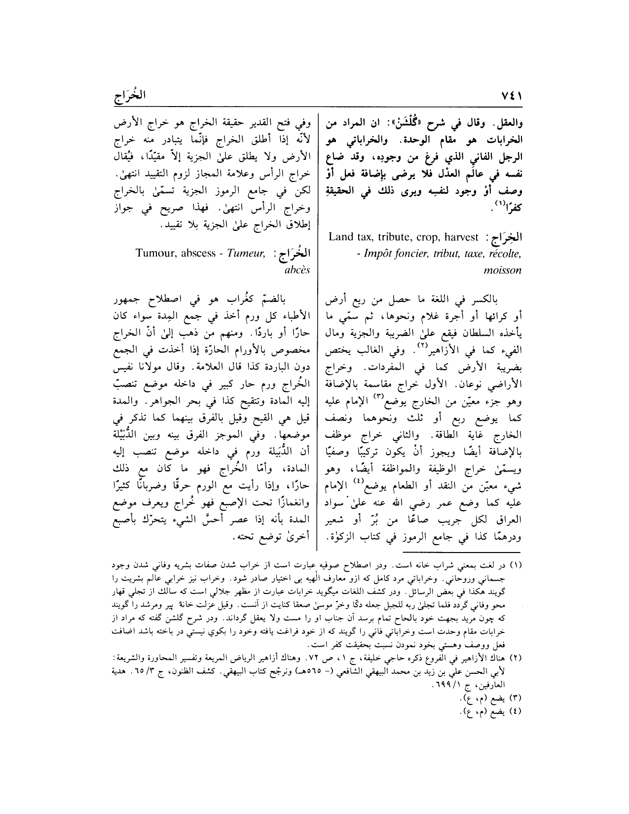 بالضمّ كغراب هو في اصطلاح جمهور الأطباء كل ورم أخذ في جمع المدة سواء كان حارا أو باردا. ومنهم من ذهب إلى أنّ الخراج مخصوص بالأورام الحارّة إذا أخذت في الجمع دون الباردة كذا قال العلامة. وقال مولانا نفيس الخراج ورم حار كبير في داخله موضع تنصبّ إليه المادة وتتقيح كذا في بحر الجواهر. والمدة قيل هي القيح وقيل بالفرق بينهما كما تذكر في موضعها. وفي الموجز الفرق بينه وبين الدّبيلة أن الدّبيلة ورم في داخله موضع تنصب إليه المادة، وأمّا الخراج فهو ما كان مع ذلك حارا، وإذا رأيت مع الورم حرقا وضربانا كثيرا وانغمازا تحت الإصبع فهو خراج ويعرف موضع المدة بأنه إذا عصر أحسّ الشيء يتحرّك بإصبع أخرى توضع تحته.