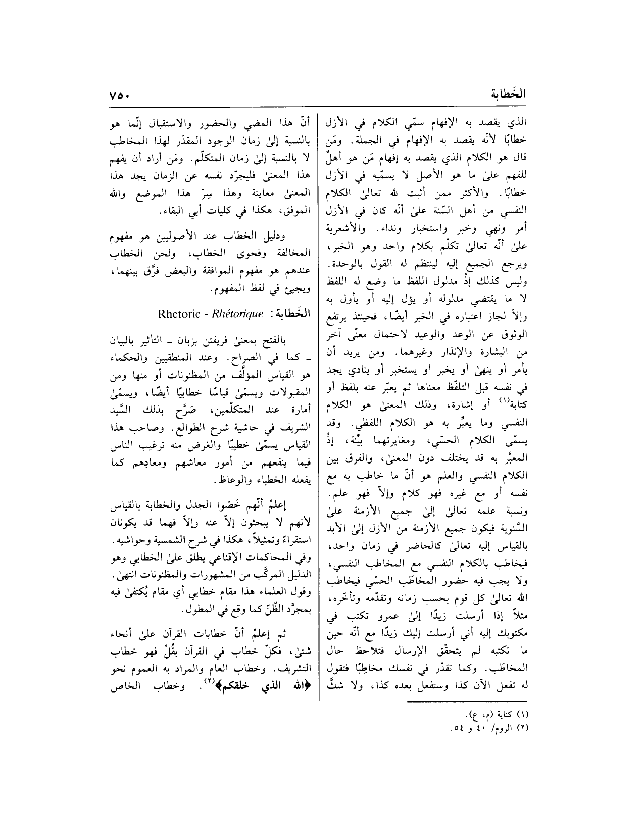 وليس كذلك إذ مدلول اللفظ ما وضع له اللفظ لا ما يقتضي مدلوله أو يئول إليه أو يأول به وإلّا لجاز اعتباره في الخبر أيضا، فحينئذ يرتفع الوثوق عن الوعد والوعيد لاحتمال معنى آخر من البشارة والإنذار وغيرهما. ومن يريد أن يأمر أو ينهى أو يخبر أو يستخبر أو ينادي يجد في نفسه قبل التلفّظ معناها ثم يعبّر عنه بلفظ أو كتابة «1» أو إشارة، وذلك المعنى هو الكلام النفسي وما يعبّر به هو الكلام اللفظي. وقد يسمّى الكلام الحسّي، ومغايرتهما بيّنة، إذ المعبّر به قد يختلف دون المعنى، والفرق بين الكلام النفسي والعلم هو أنّ ما خاطب به مع نفسه أو مع غيره فهو كلام وإلّا فهو علم.