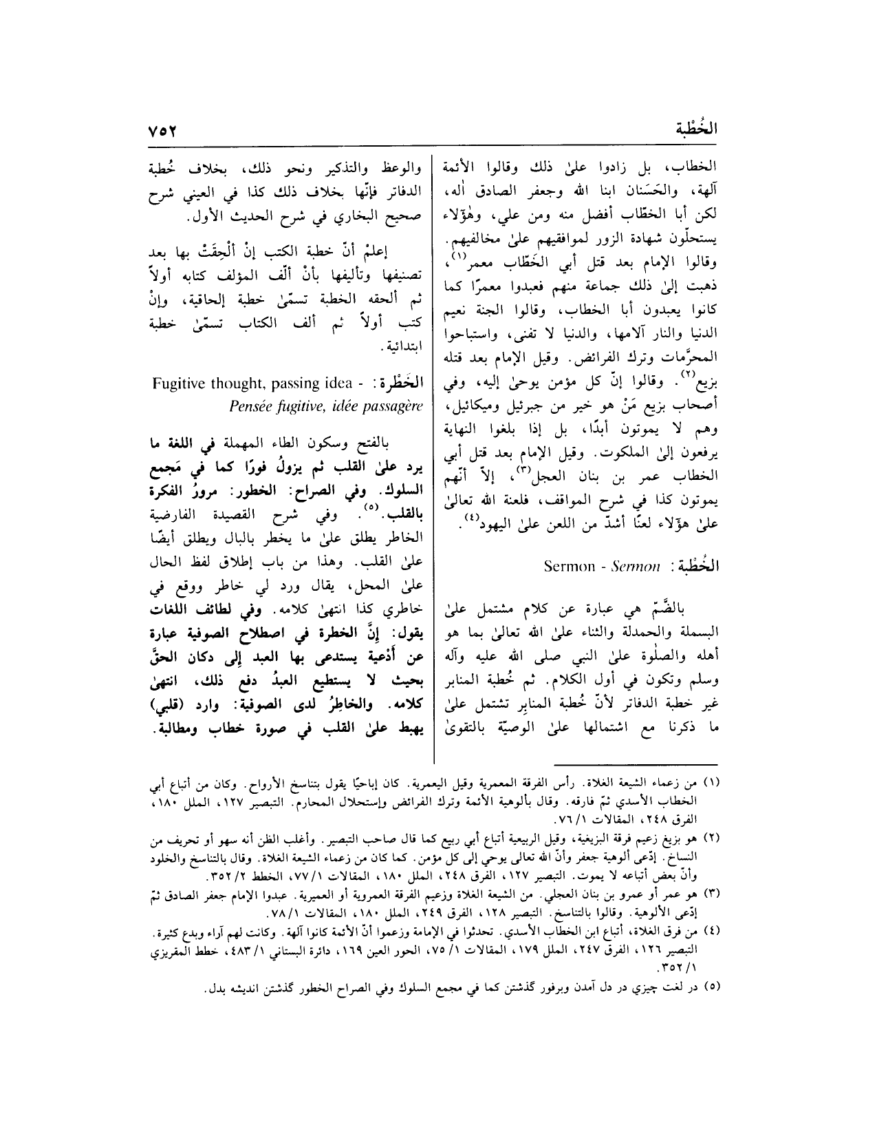 (4) من فرق الغلاة، أتباع ابن الخطاب الأسدي. تحدثوا في الإمامة وزعموا أنّ الأئمة كانوا آلهة. وكانت لهم آراء وبدع كثيرة.