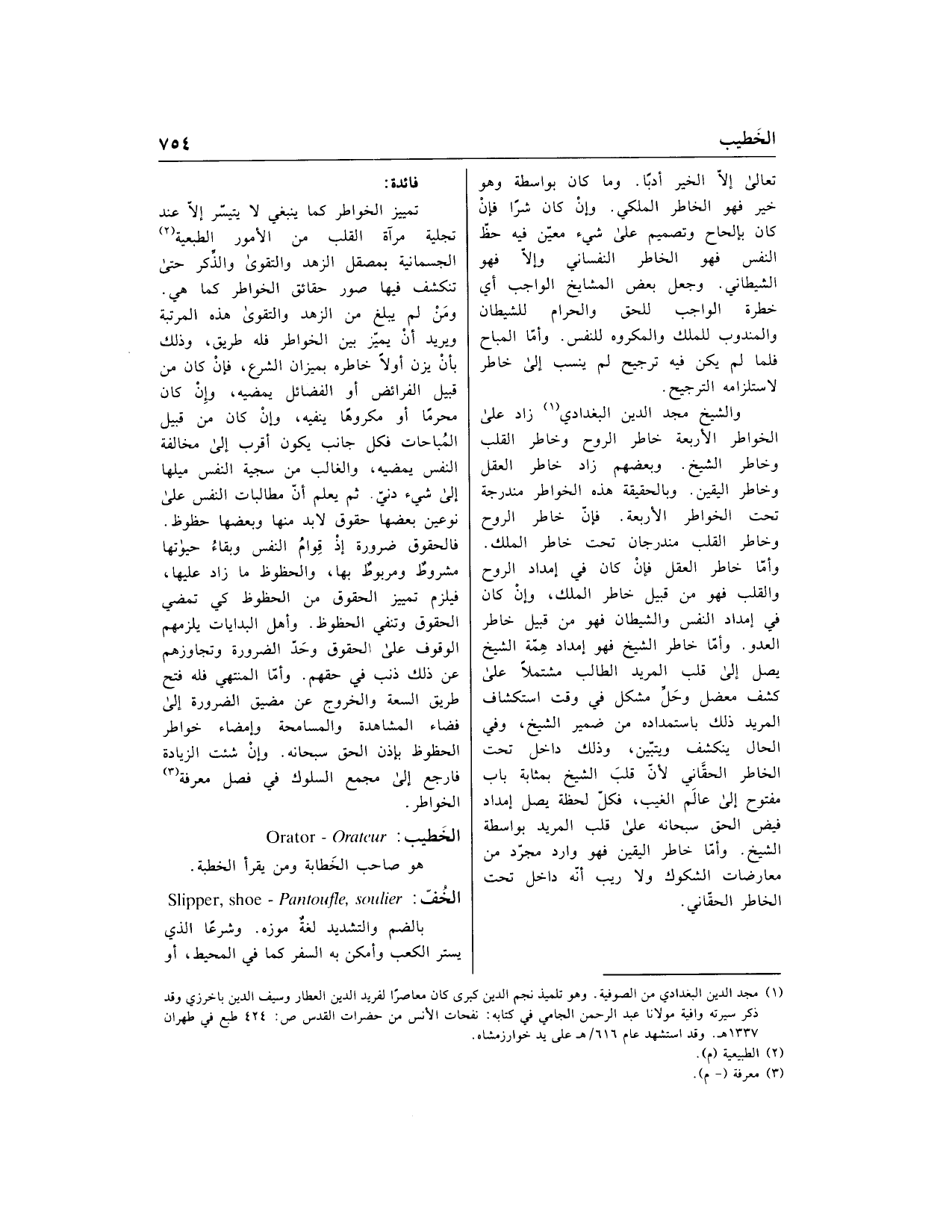 والشيخ مجد الدين البغدادي «1» زاد على الخواطر الأربعة خاطر الروح وخاطر القلب وخاطر الشيخ. وبعضهم زاد خاطر العقل وخاطر اليقين. وبالحقيقة هذه الخواطر مندرجة تحت الخواطر الأربعة. فإنّ خاطر الروح وخاطر القلب مندرجان تحت خاطر الملك.