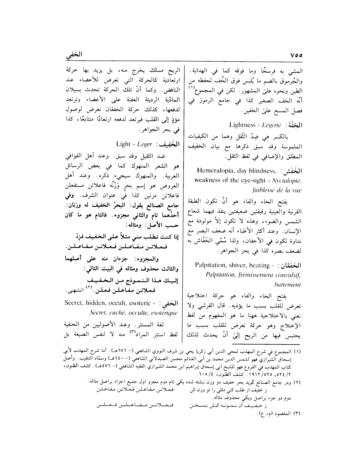 ضد الثقيل وقد سبق. وعند أهل القوافي هو الشعر المنهوك كما في بعض الرسائل العربية. والمنهوك سيجيء ذكره. وعند أهل العروض هو اسم بحر وزنه فاعلاتن مستفعلن فاعلاتن مرتين كذا في عنوان الشرف. وفي جامع الصنائع يقول: البحر الخفيف له وزنان: