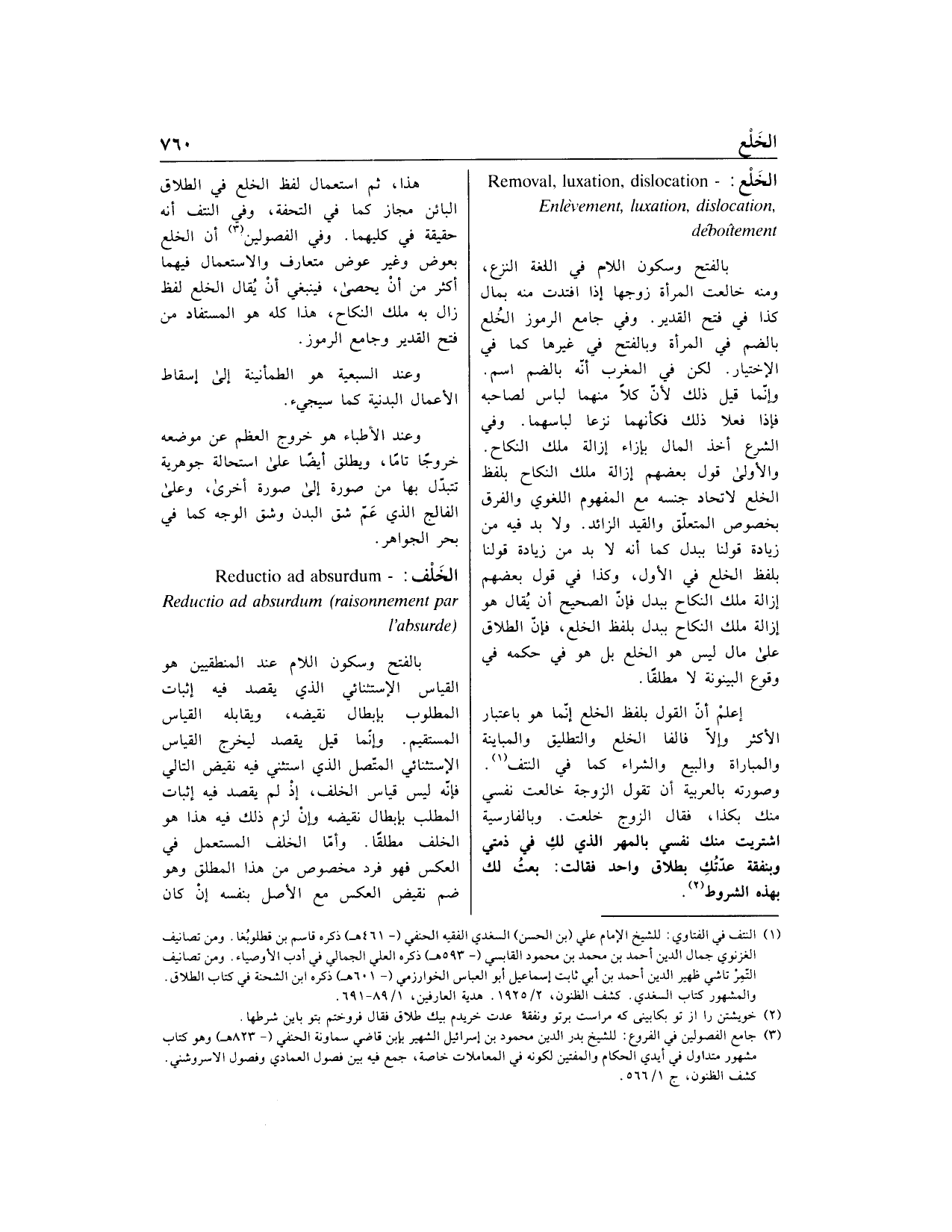 بالفتح وسكون اللام في اللغة النزع، ومنه خالعت المرأة زوجها إذا افتدت منه بمال كذا في فتح القدير. وفي جامع الرموز الخلع بالضم في المرأة وبالفتح في غيرها كما في الاختيار. لكن في المغرب أنّه بالضم اسم.