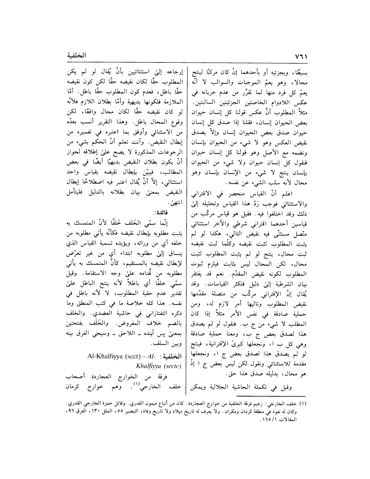 إنّما سمّي الخلف خلفا لأنّ المتمسك به يثبت مطلوبه بإبطال نقيضه فكأنّه يأتي مطلوبه من خلفه أي من ورائه، ويؤيده تسمية القياس الذي ينساق إلى مطلوبه ابتداء أي من غير تعرّض لإبطال نقيضه بالمستقيم، كأنّ المتمسك به يأتي مطلوبه من قدامه على وجه الاستقامة. وقيل سمّي خلفا أي باطلا لأنه ينتج الباطل على تقدير عدم حقية المطلوب، لا لأنه باطل في نفسه. هذا كله خلاصة ما في كتب المنطق وما ذكره التفتازاني في حاشية العضدي. والخلف بالضم خلاف المفروض. والخلف بفتحتين بمعنى پس آينده- اللاحق- وسيجيء الفرق بينه وبين السلف.