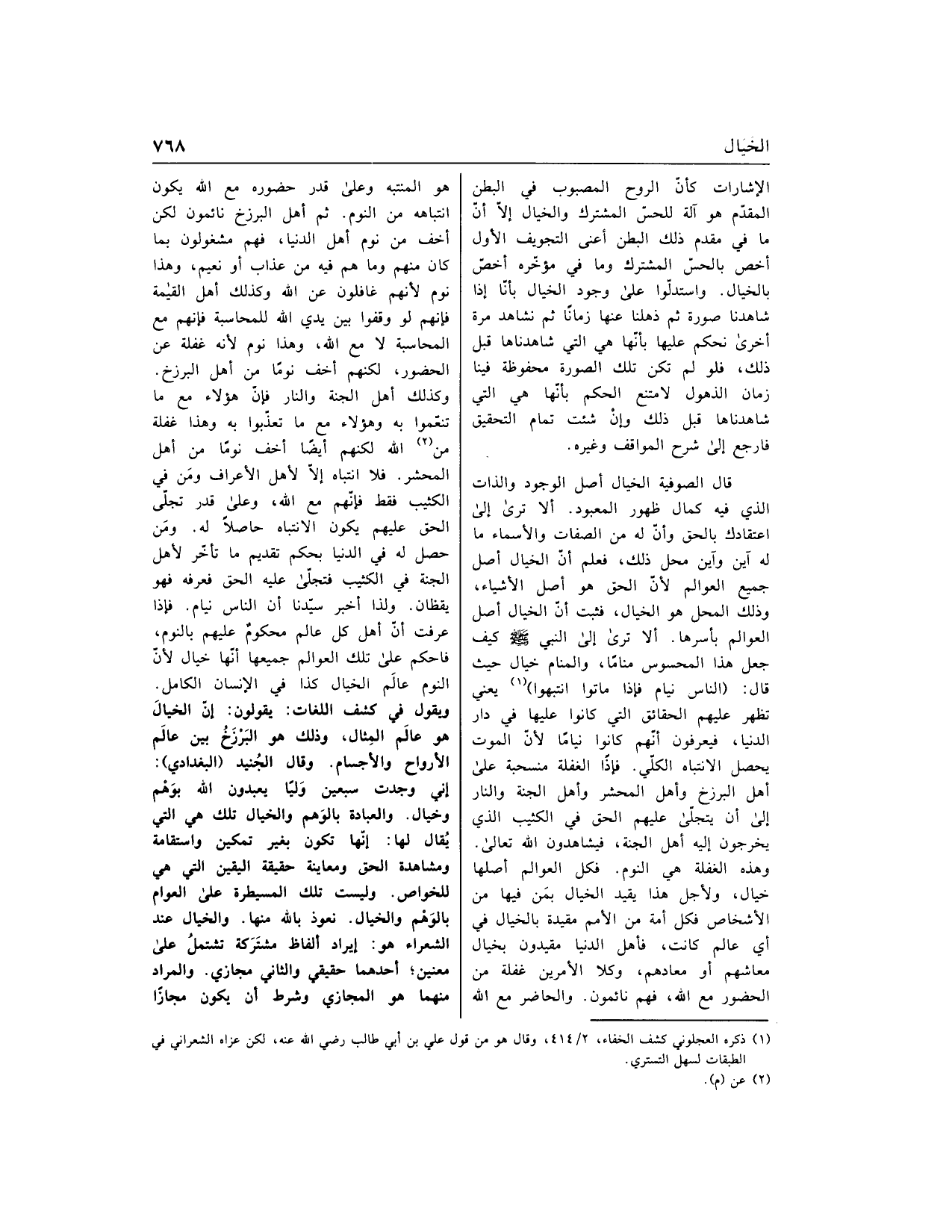 ويقول في كشف اللغات: يقولون: إنّ الخيال هو عالم المثال، وذلك هو البرزخ بين عالم الأرواح والأجسام. وقال الجنيد (البغدادي):